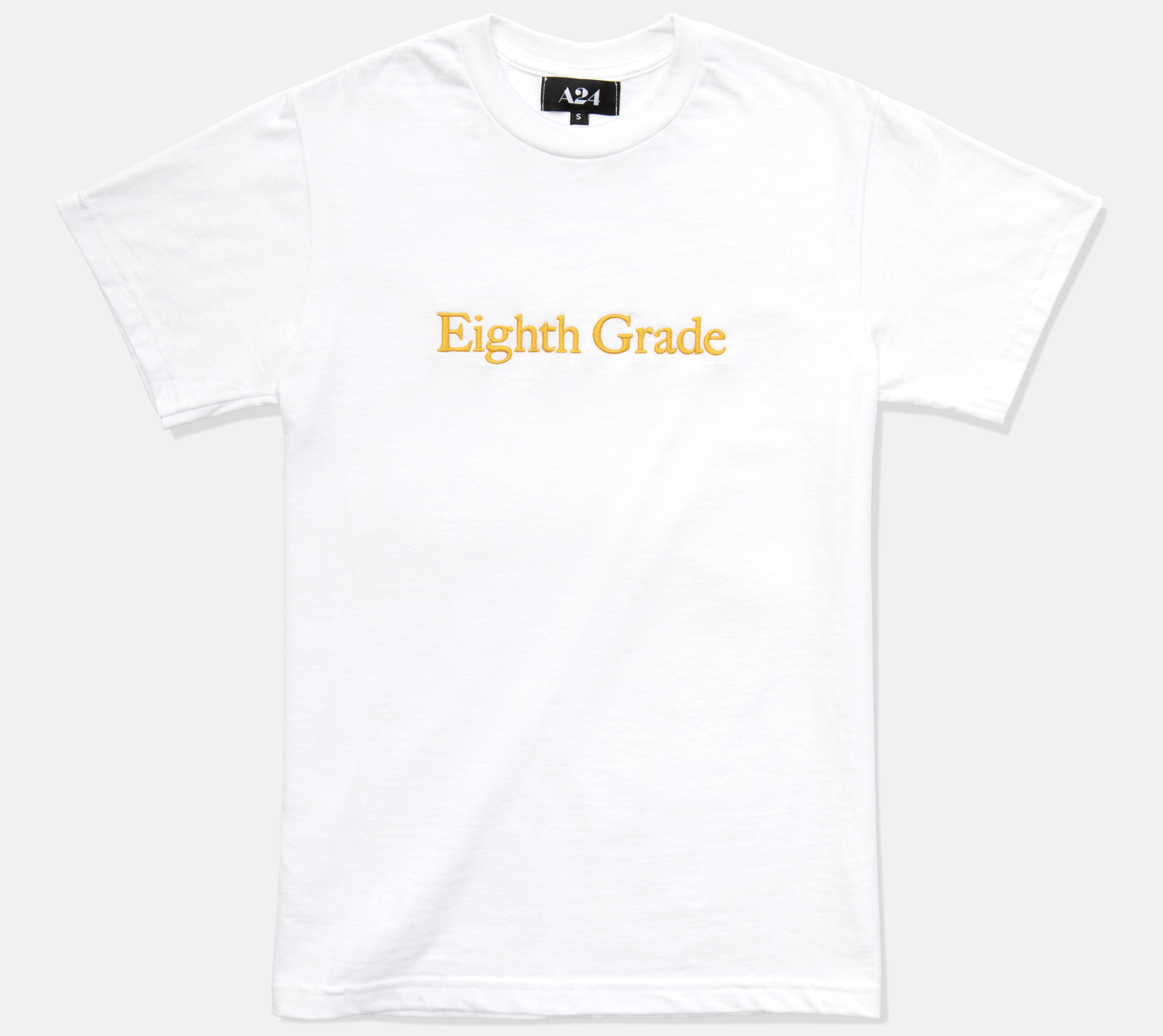 White short sleeve cotton t-shirt with yellow embroidery across chest and A24 woven label inside. Fits true-to-size.