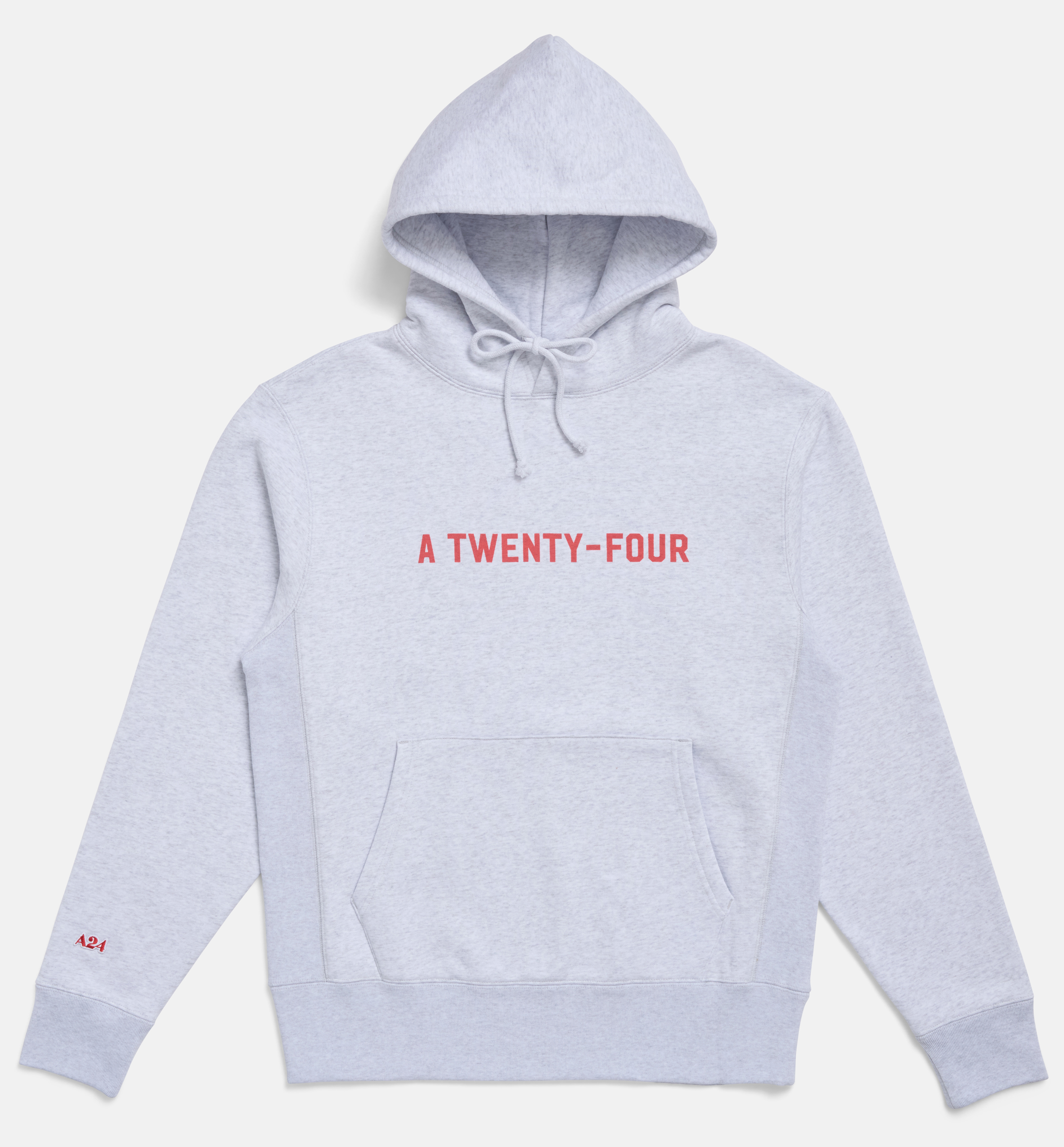 Grey cut-and-sew hoodie with red screen printed text and embroidered logo patch.