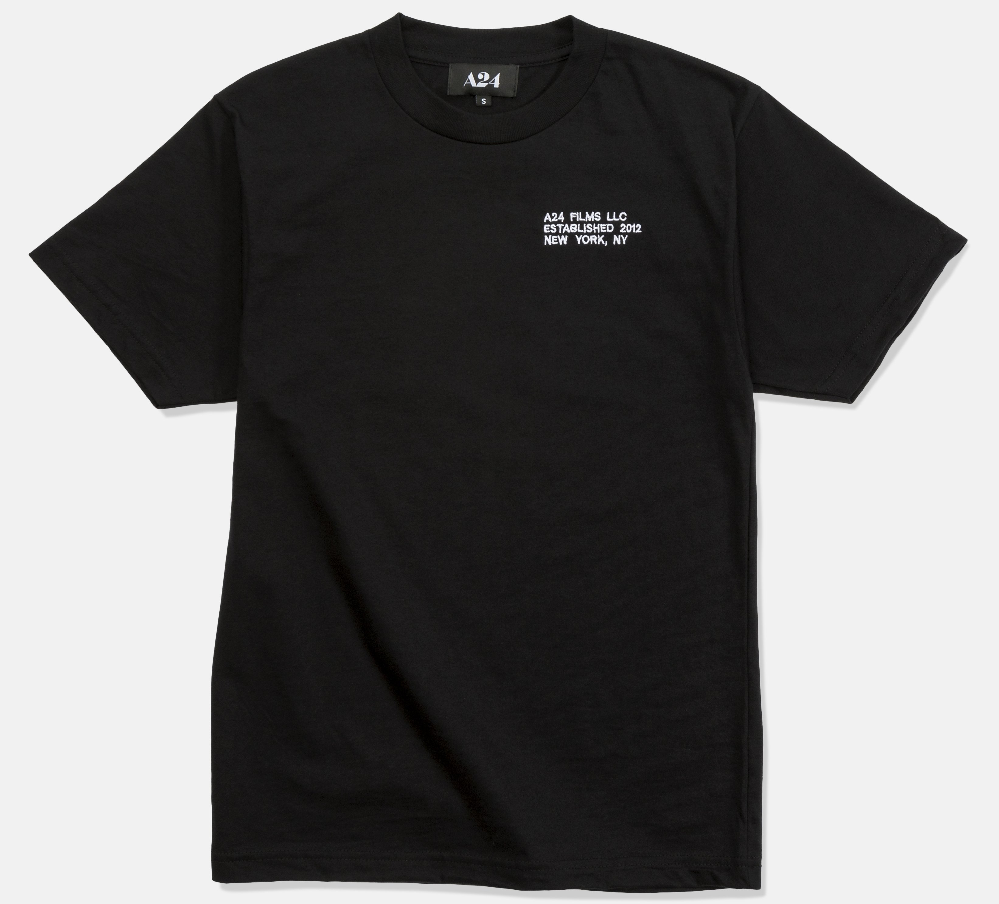 Black short sleeve cotton t-shirt with white embroidery on left chest and A24 woven label inside. Fits true-to-size.
