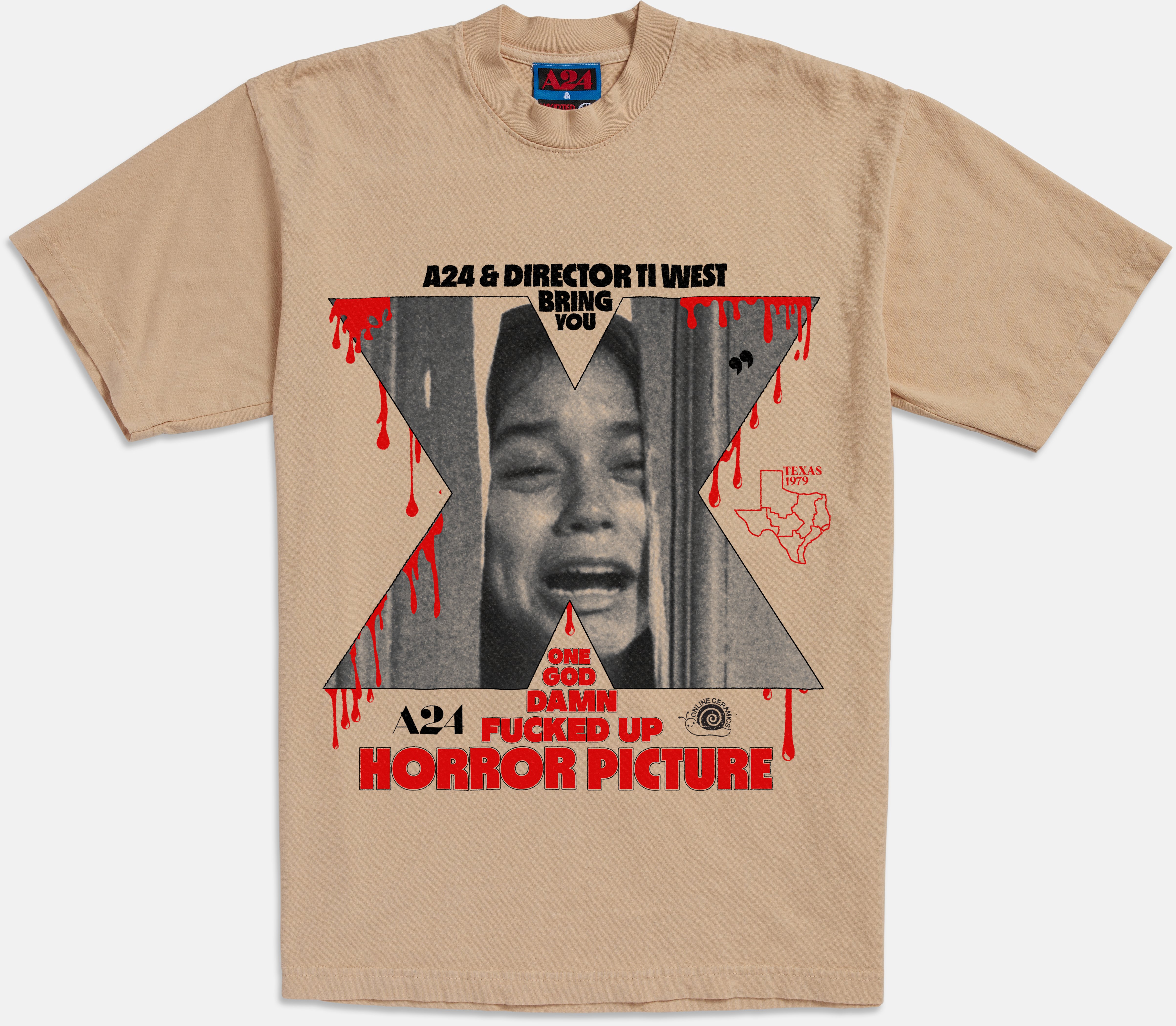 Tan t-shirt from Online Ceramics x X collection, available exclusively in the A24 Shop.