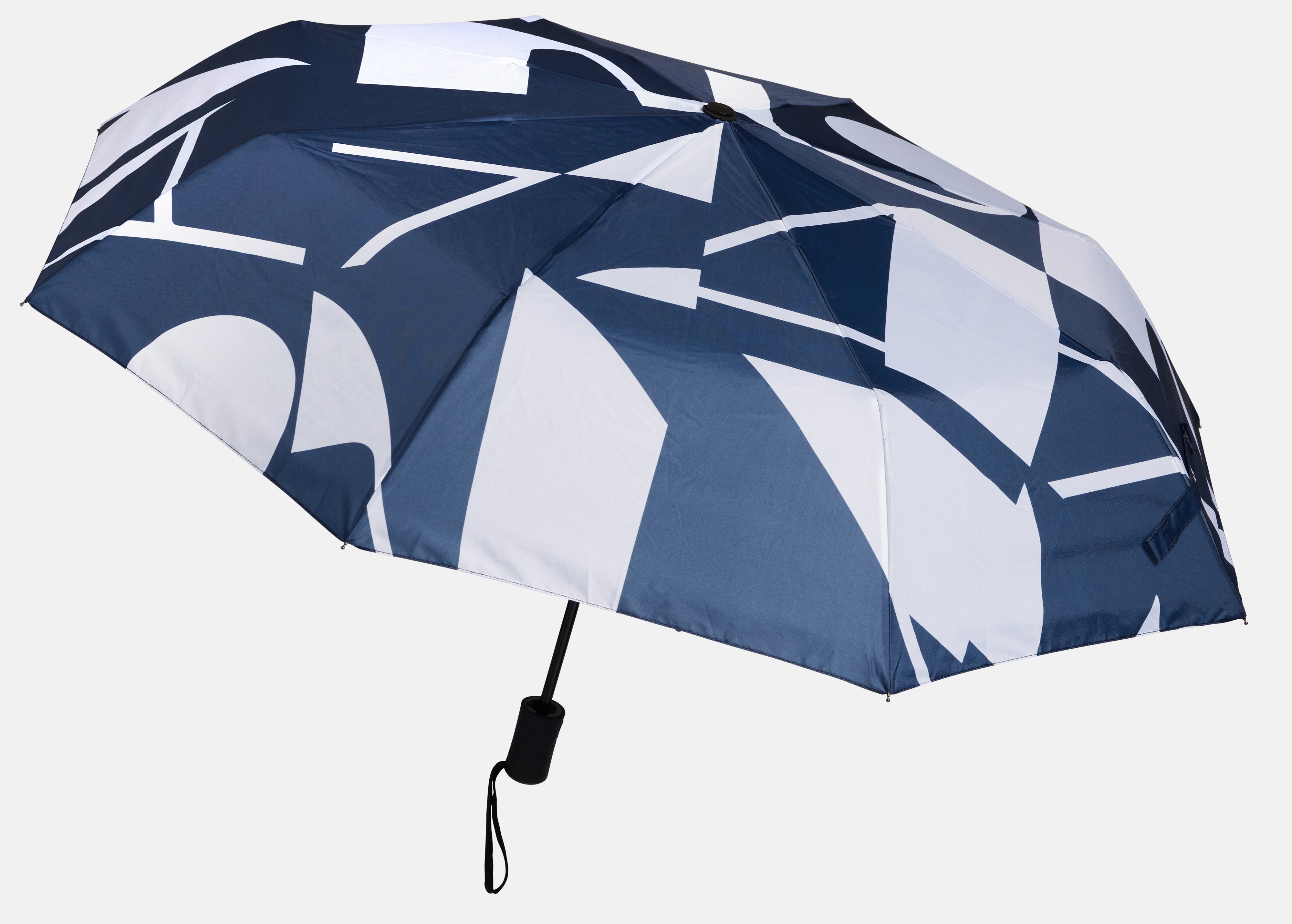 Compact travel umbrella with screenprinted scrambled a24 logo. Velcro closure, wrist strap, and soft-grip handle with automatic open and close button.