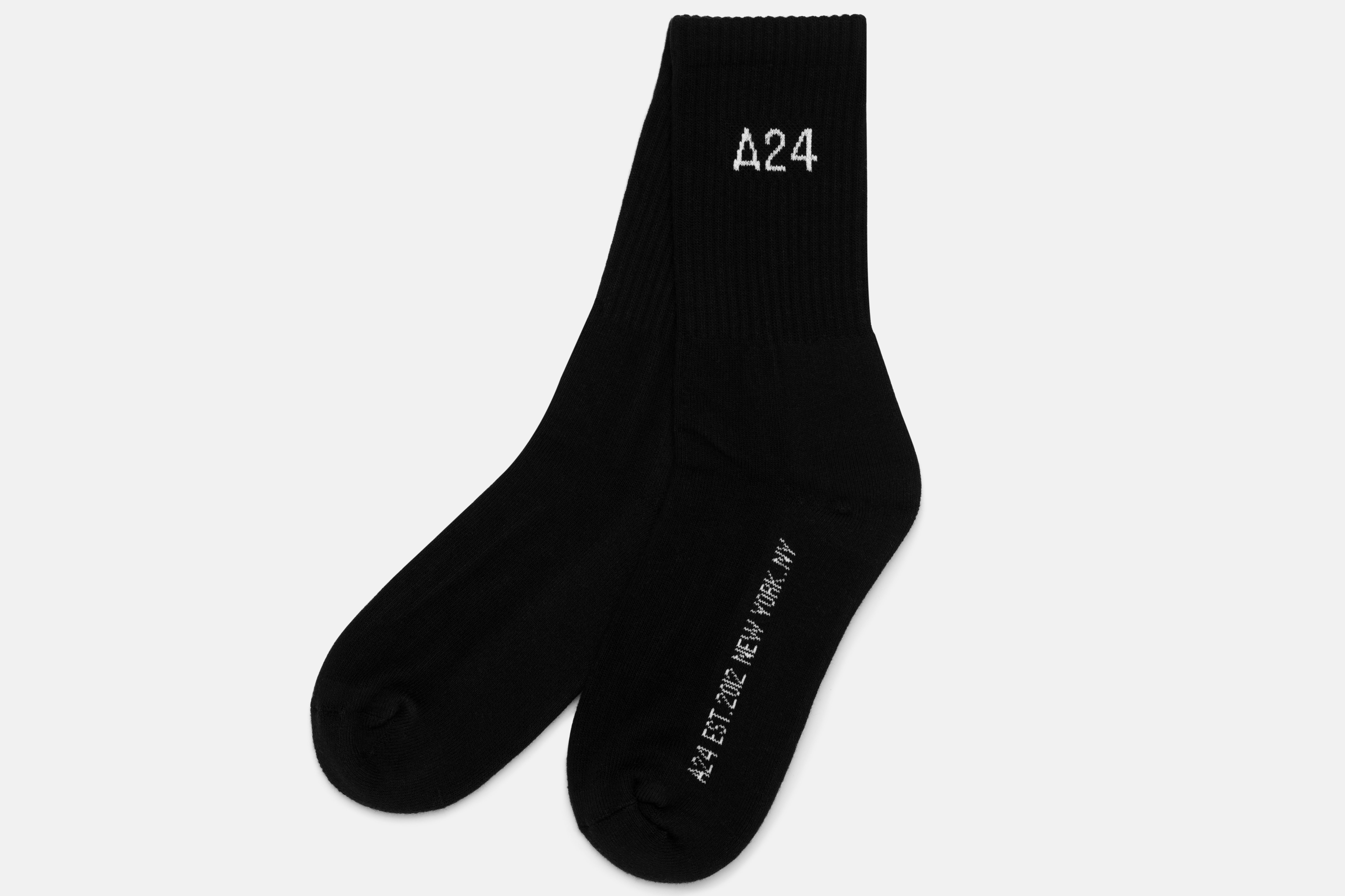 Calf-high cotton socks in black. Logo knit in black at rib knit cuffs. Text knit in black on side. Tonal stitching.