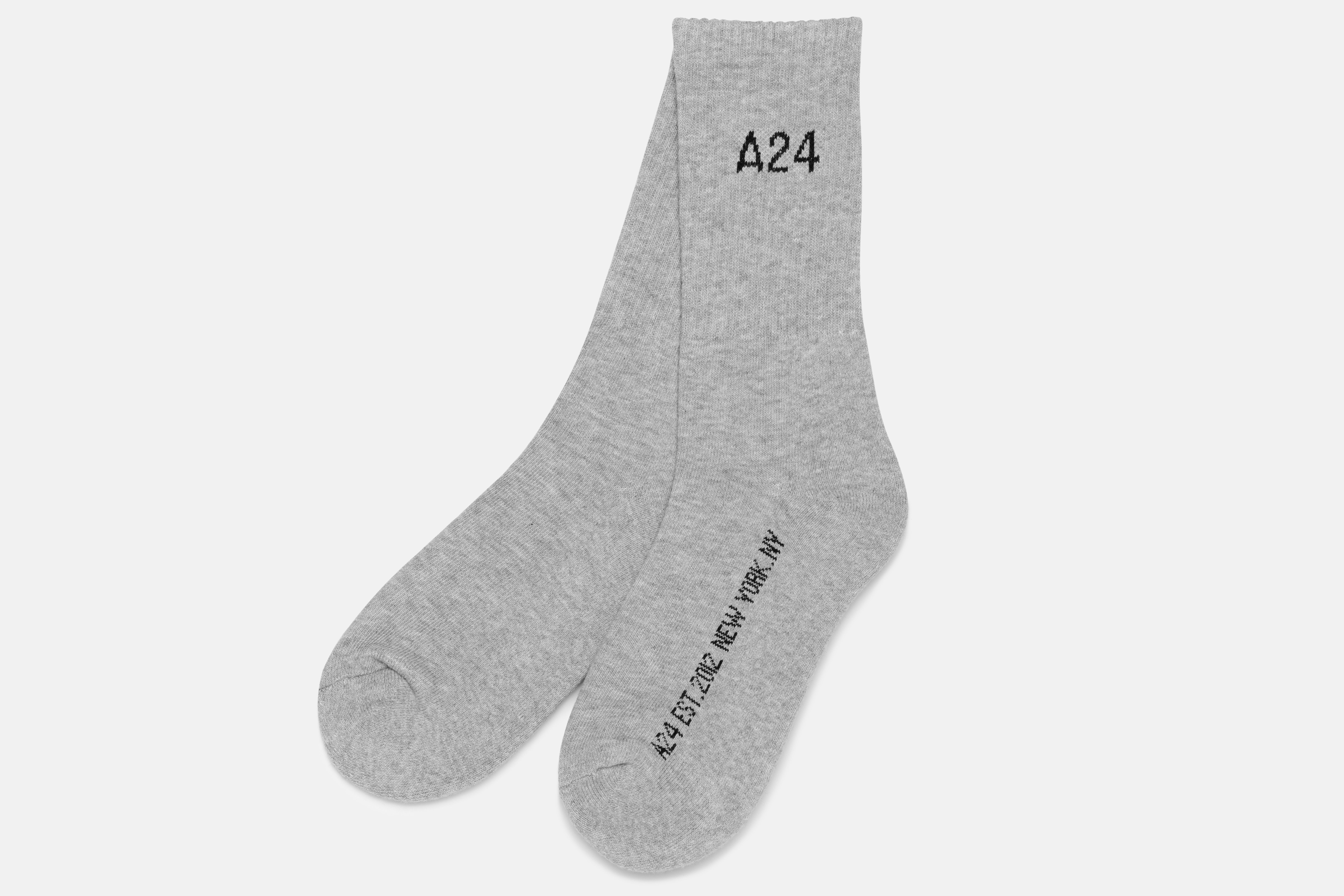 Calf-high cotton socks in grey. Logo knit in black at rib knit cuffs. Text knit in black on side. Tonal stitching.
