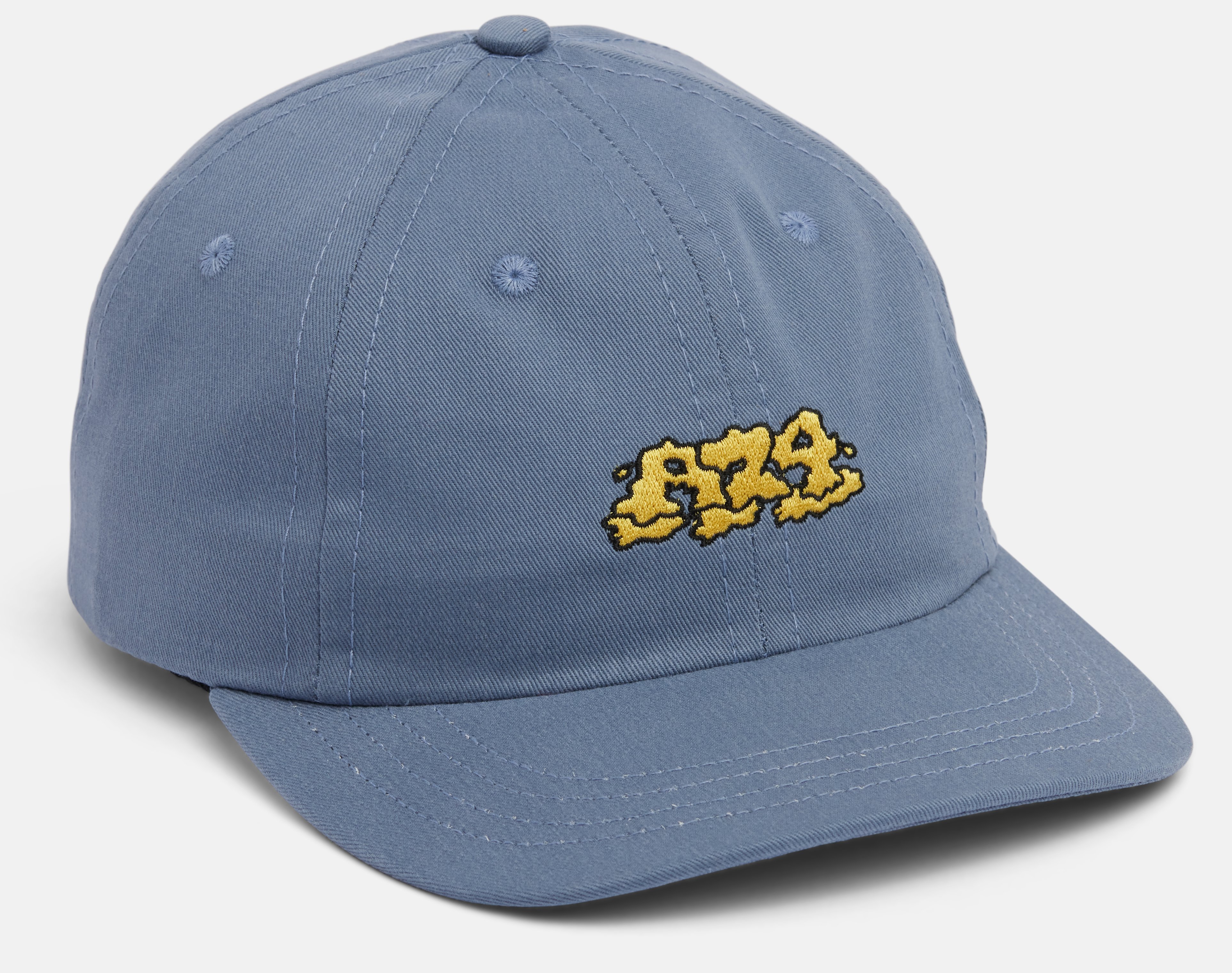 Slate blue hat with yellow embroidery on front and back. Logo illustration by Jordan Awan.