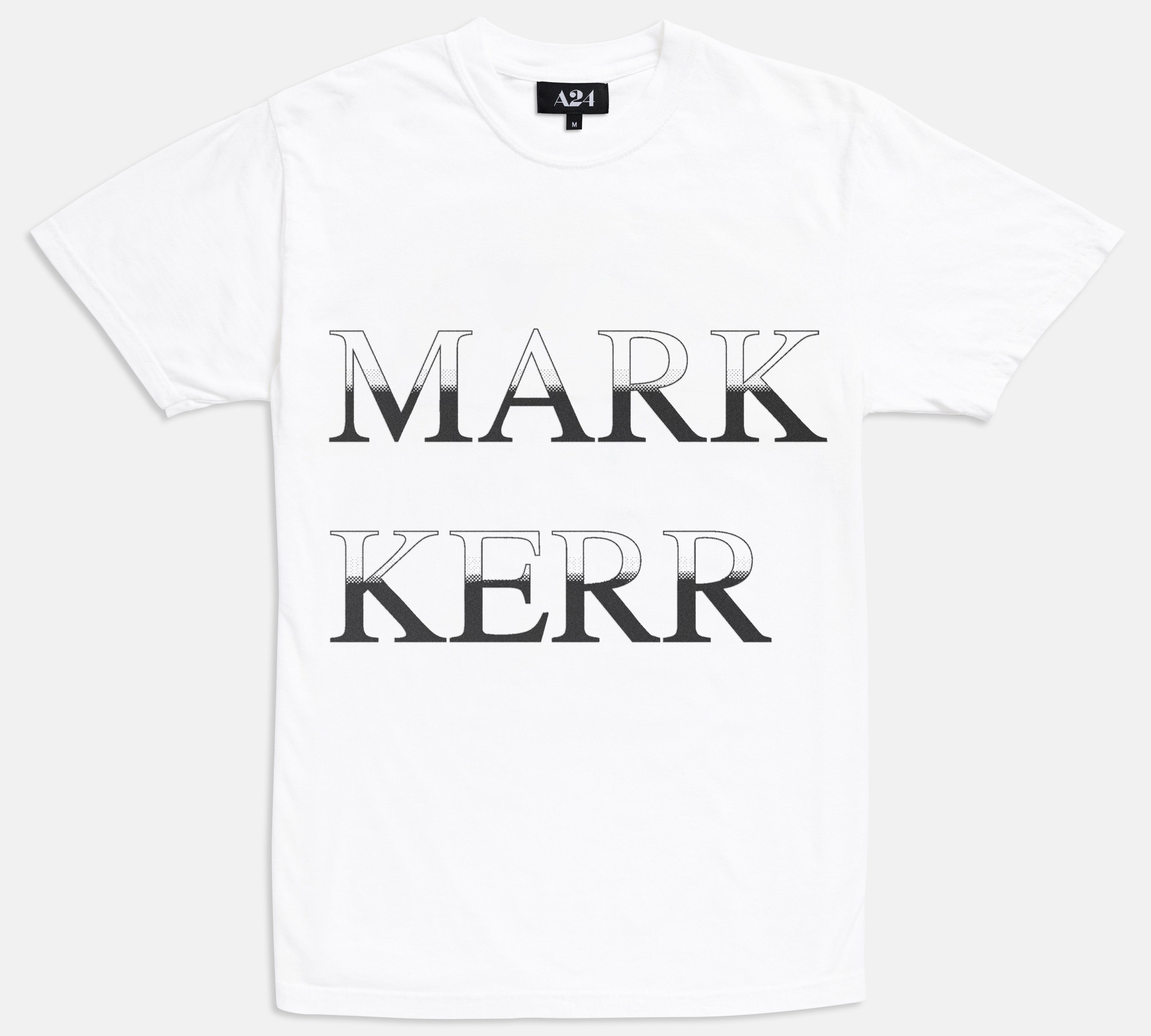 White short sleeve t-shirt with screen printed text on front. A24 woven label inside.