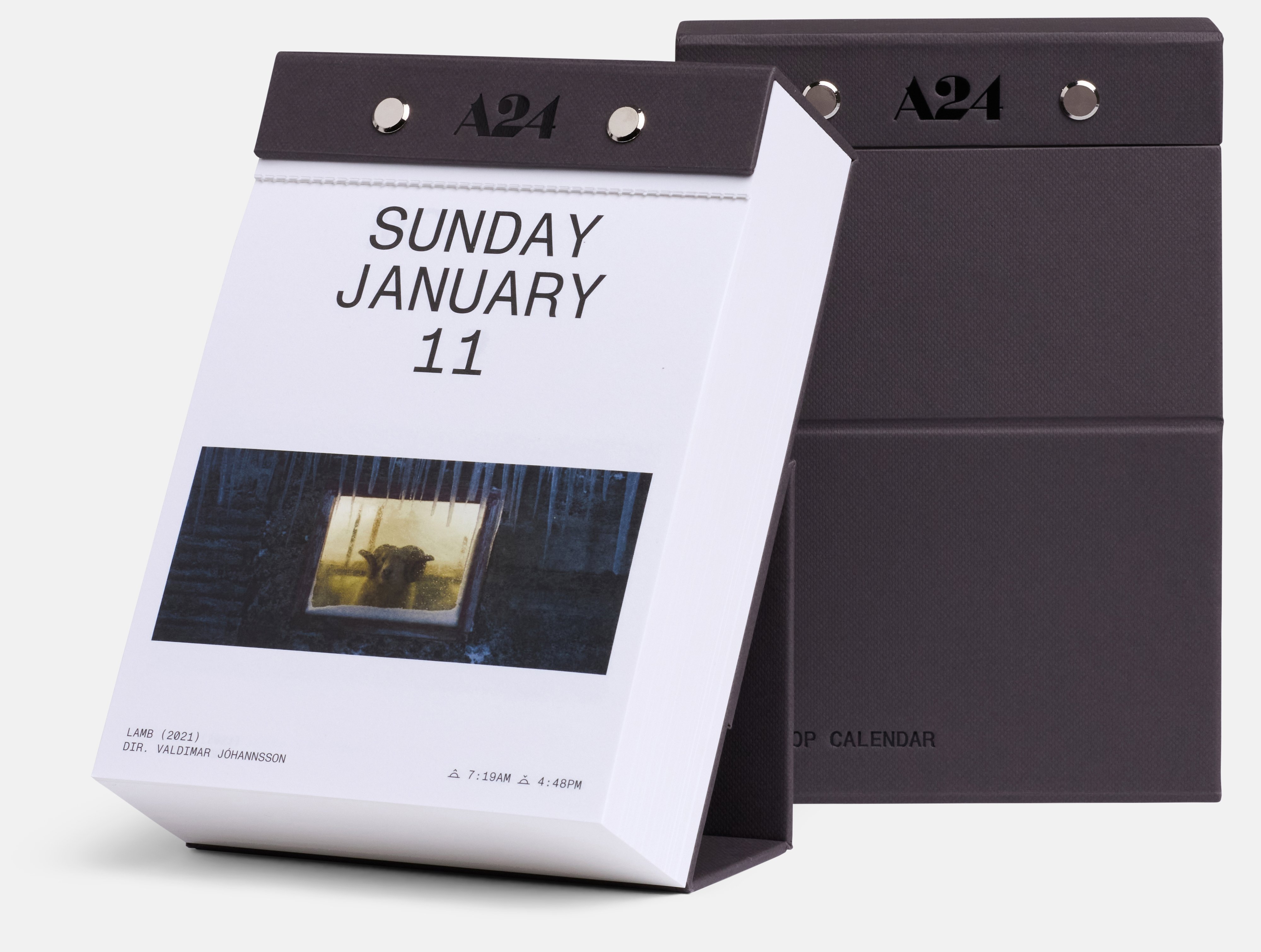Calendar includes daily tear-off pages featuring seasonal film frames from across the A24 library. Encased in a book cloth-wrapped cover, with an embossed logo and wrap-around magnetic stand.