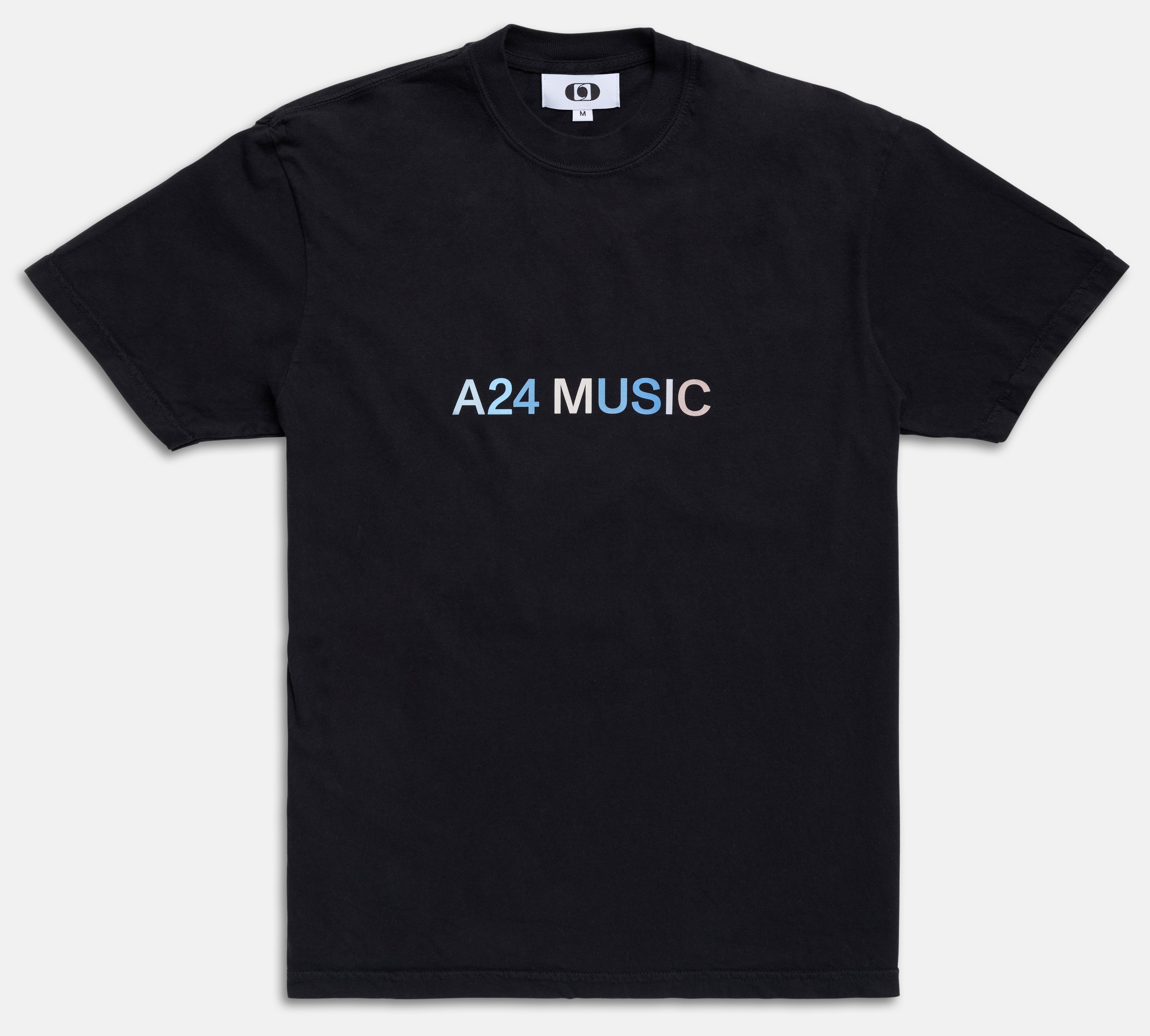 Black short sleeve t-shirt with screenprinted text on the front and logo graphic on the back.