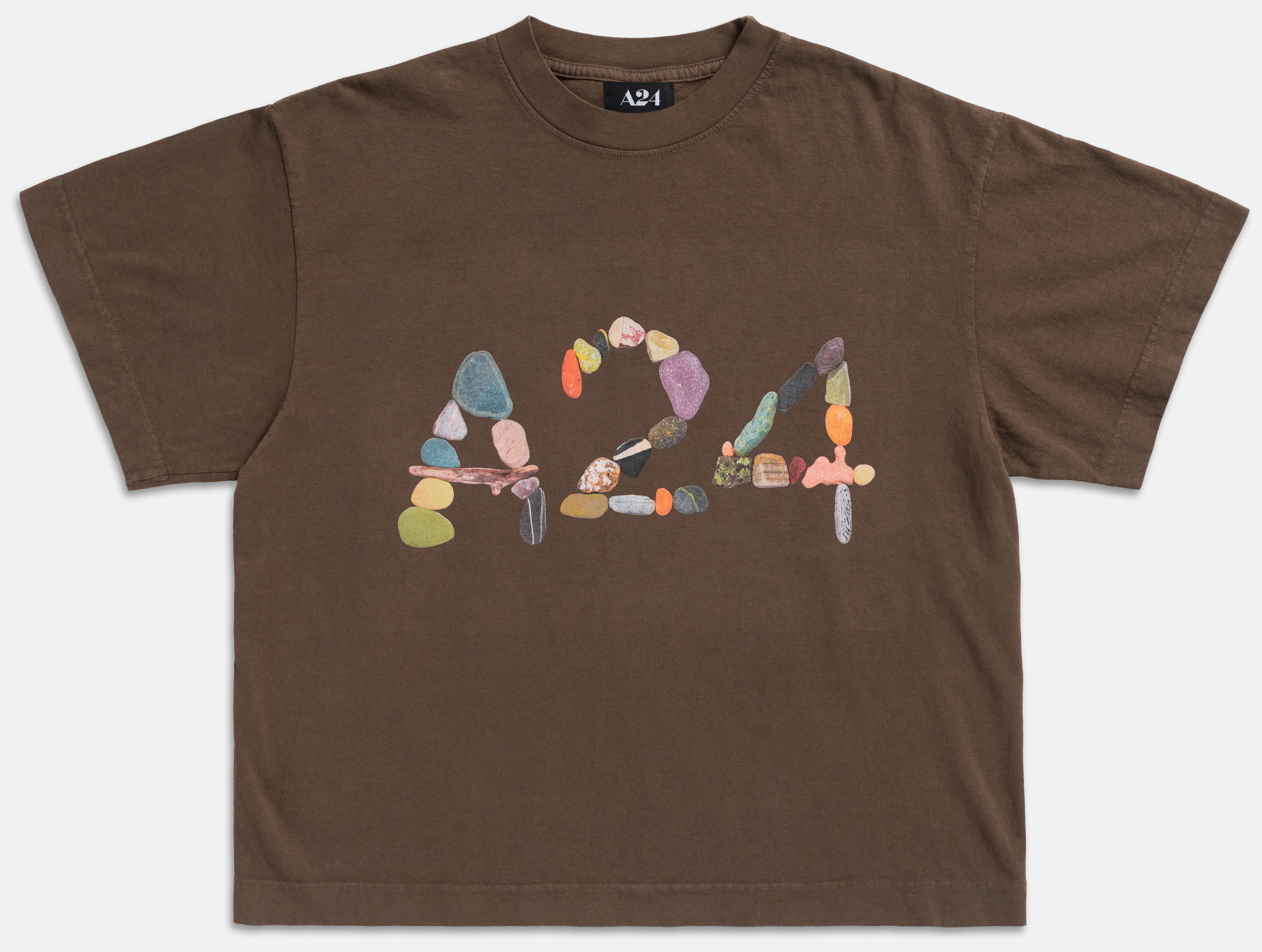 Brown short sleeve boxy tee with screen printed logo graphic on front. A24 woven label inside.