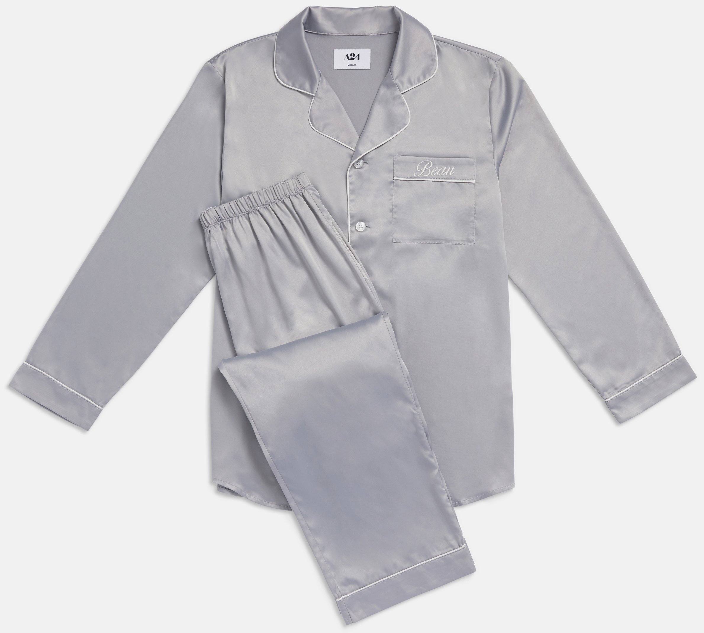 Grey satin chiffon pajama set with white piping and embroidery. Oversize fit.