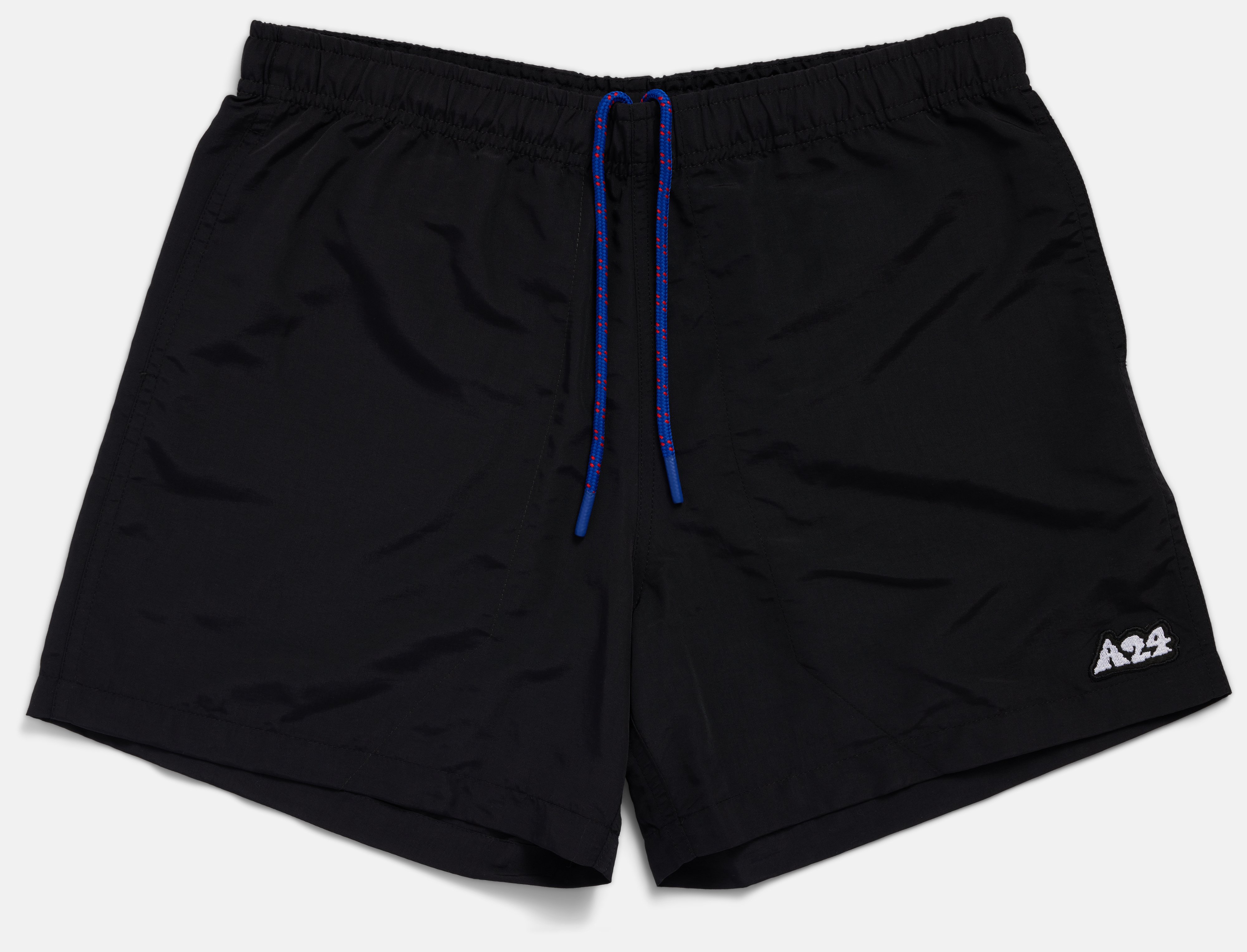 Unisex nylon shorts with multicolor drawcord and embroidered patch. Features back pocket with metal snap and interior coin pocket.