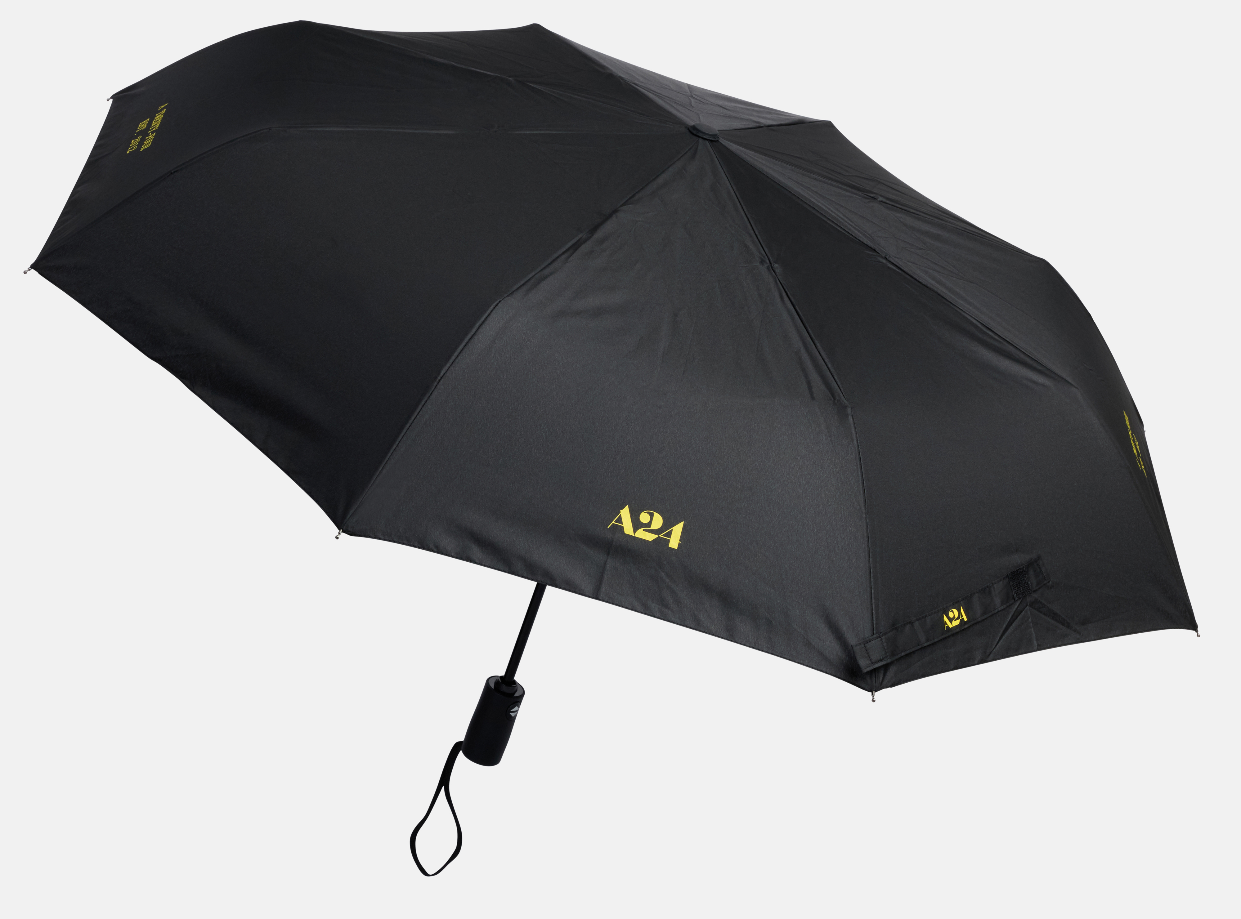 Compact travel umbrella with yellow logo and text. Velcro closure, wrist strap, and soft-grip handle with automatic open and close button.
