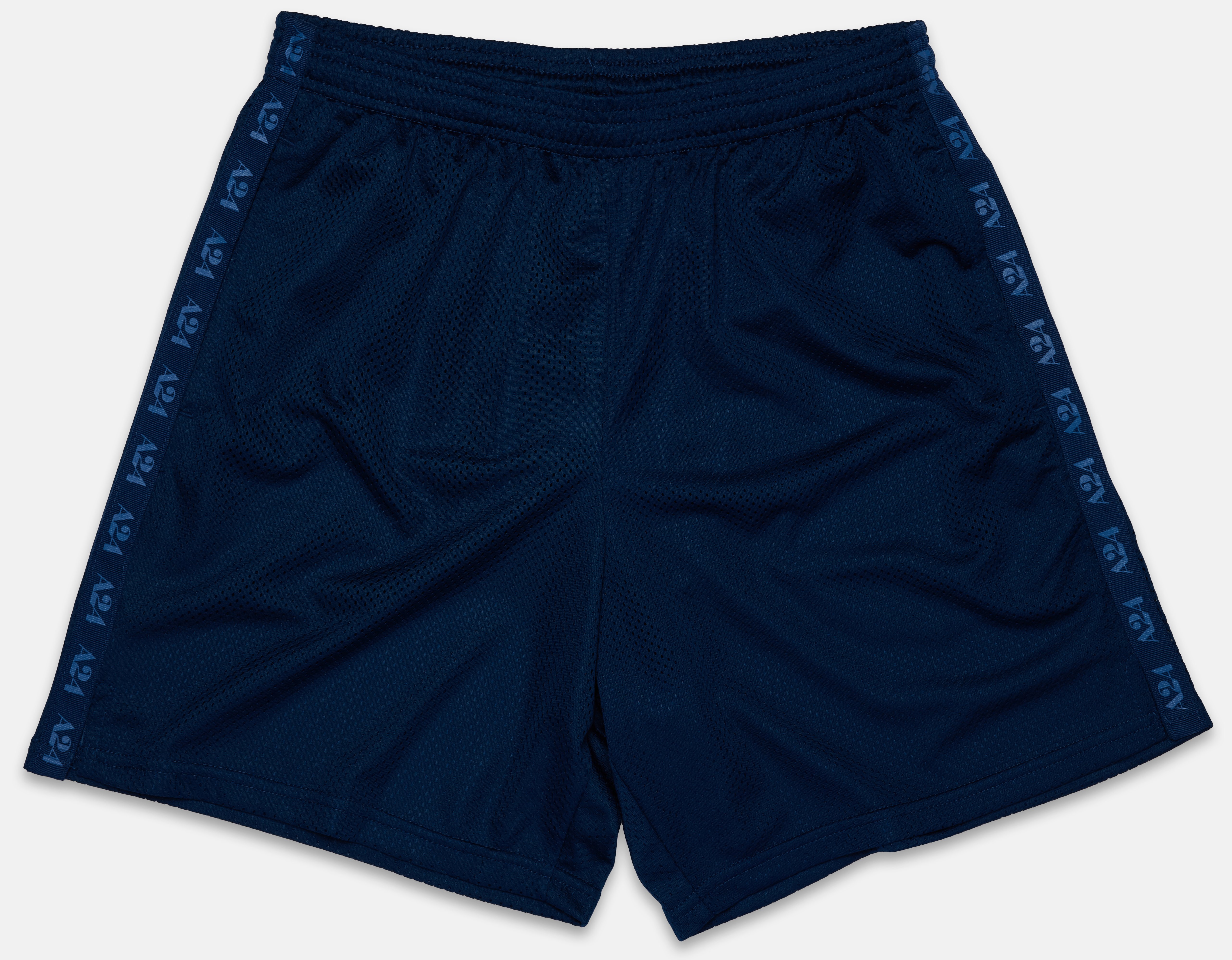 Unisex mesh shorts with deep side pockets, A24 piping, elastic waistband and internal quick cord for adjustable fit. Extremely comfy.