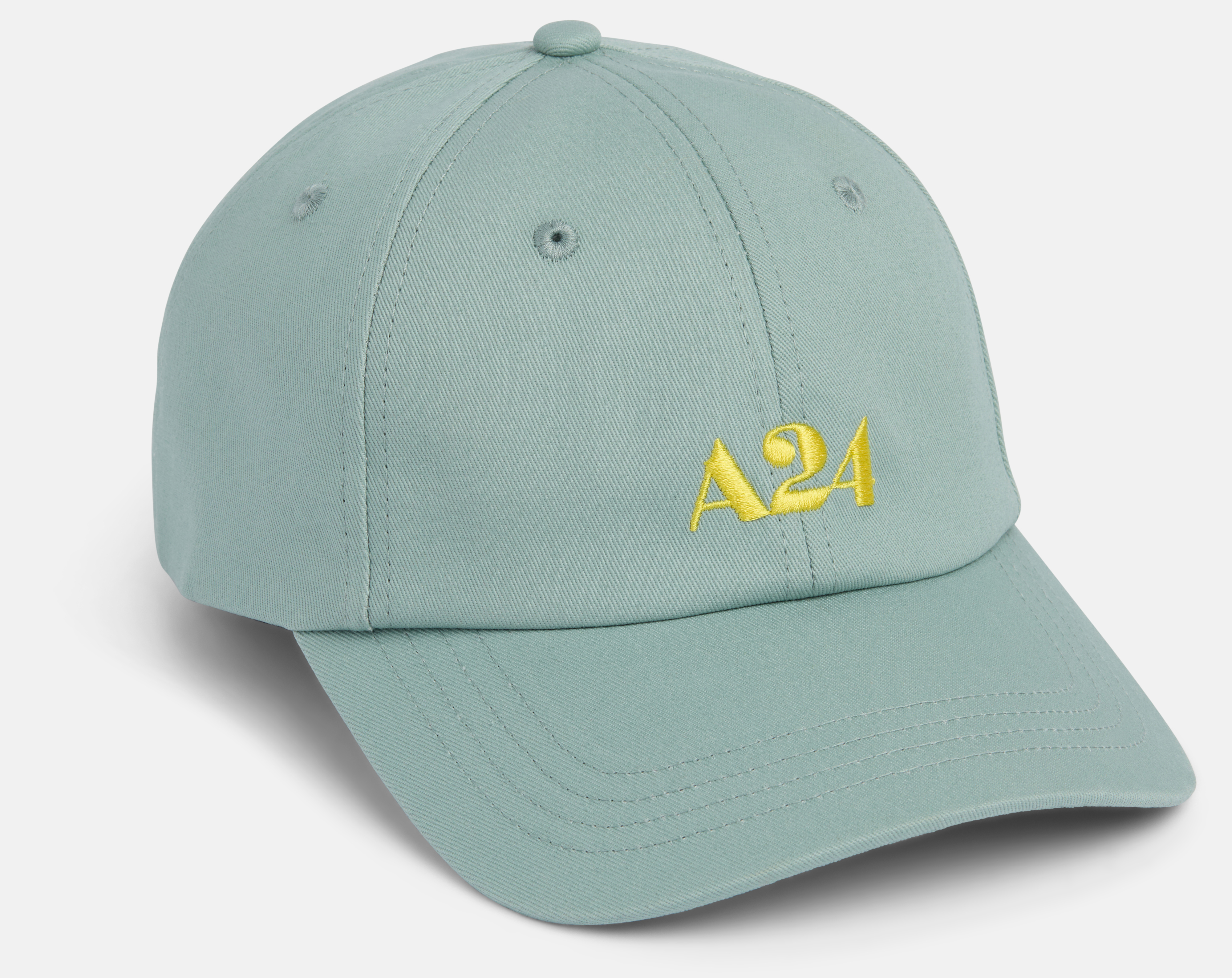 Sky blue structured lightweight cotton twill cap with adjustable strap. Yellow A24 logo embroidery on front and back.