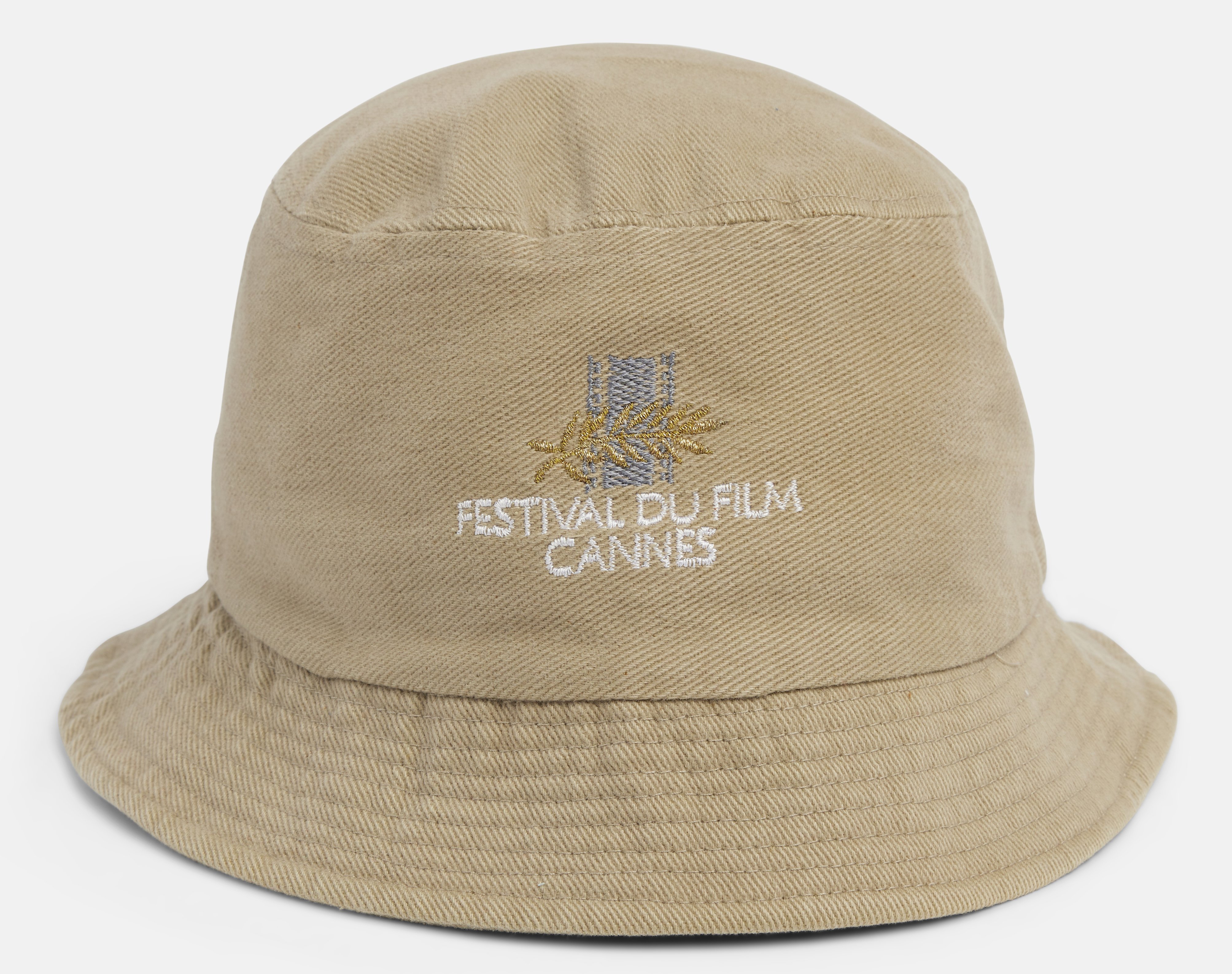 Khaki Cannes Film Festival bucket hat with gold and white embroidery. Great condition.