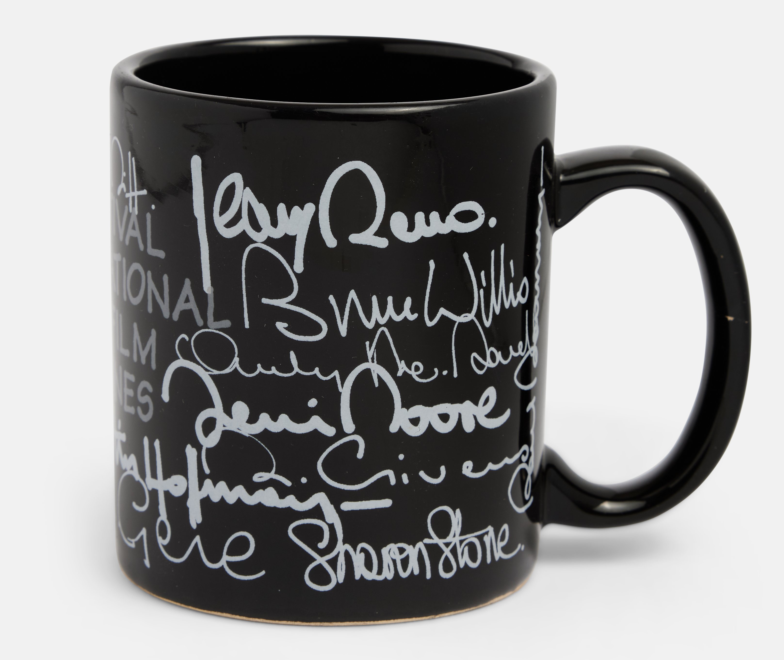 Black porcelain Cannes Film Festival mug with autographs of the stars design.