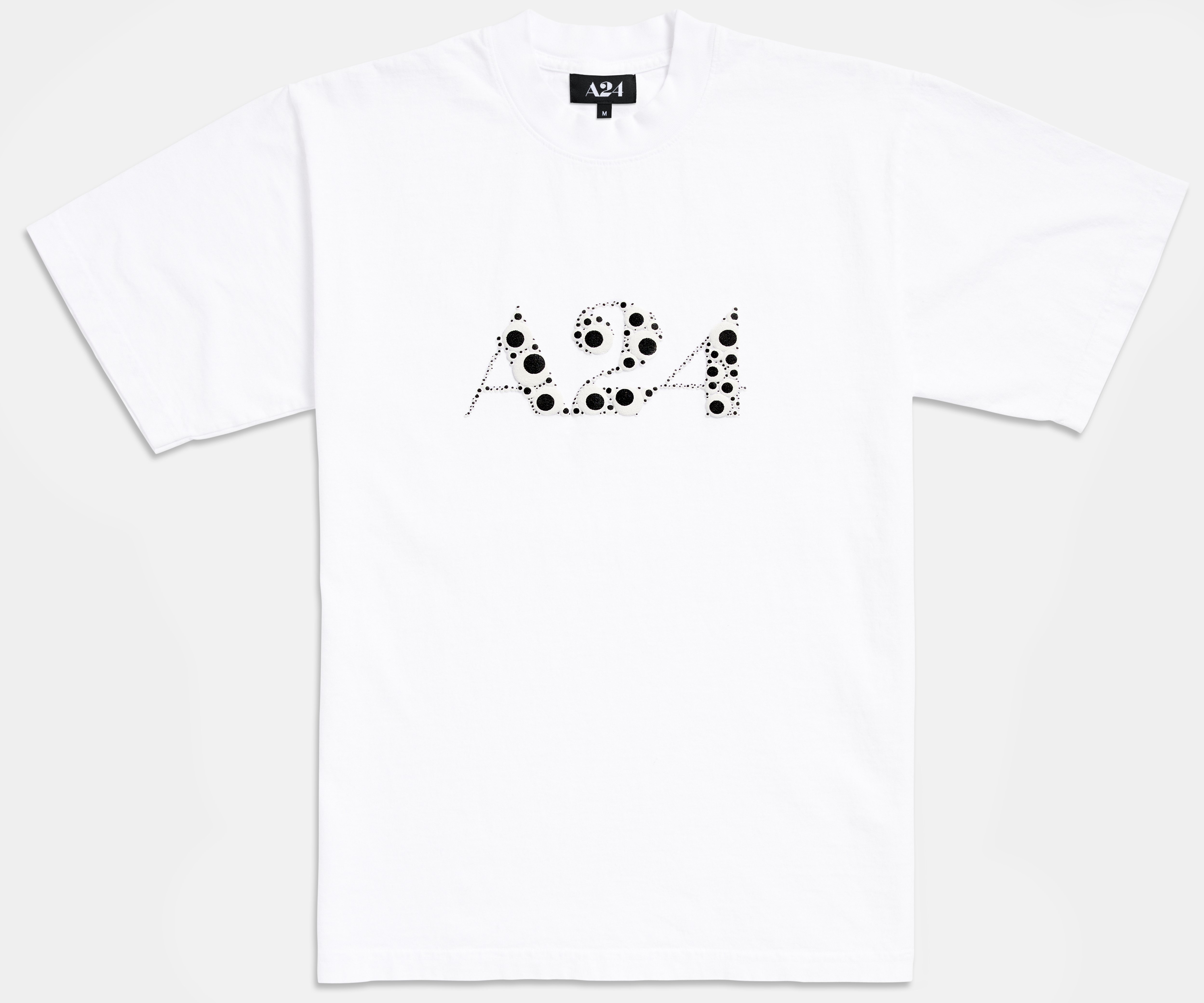 White puff print t-shirt featuring googly eye logo from Everything Everywhere All at Once.