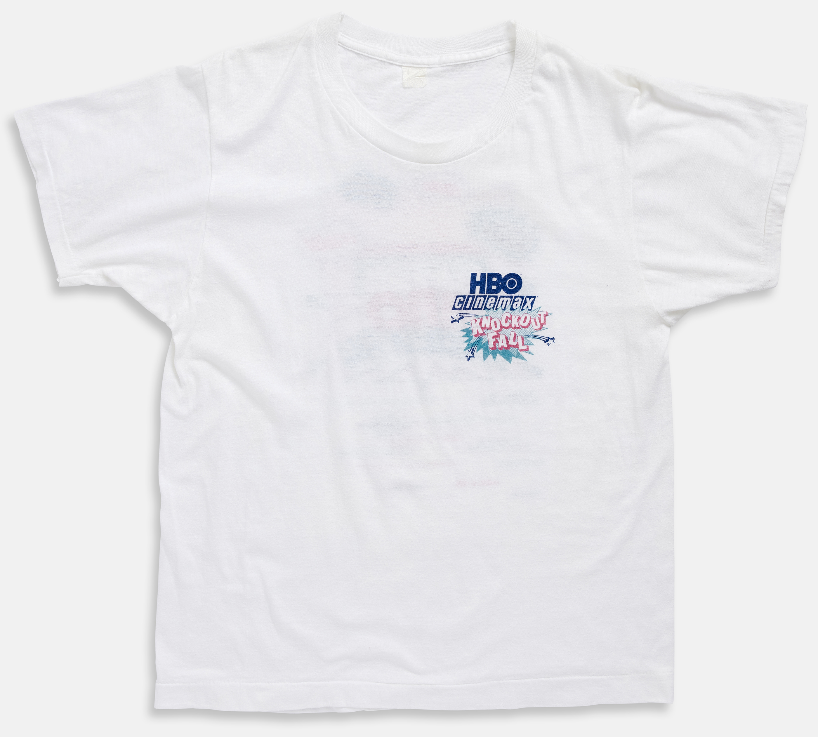 Promotional t-shirt for HBO and Cinemax's 1985 "Knockout Fall" line-up. Graphic on back side with featured titles. Good vintage condition.
