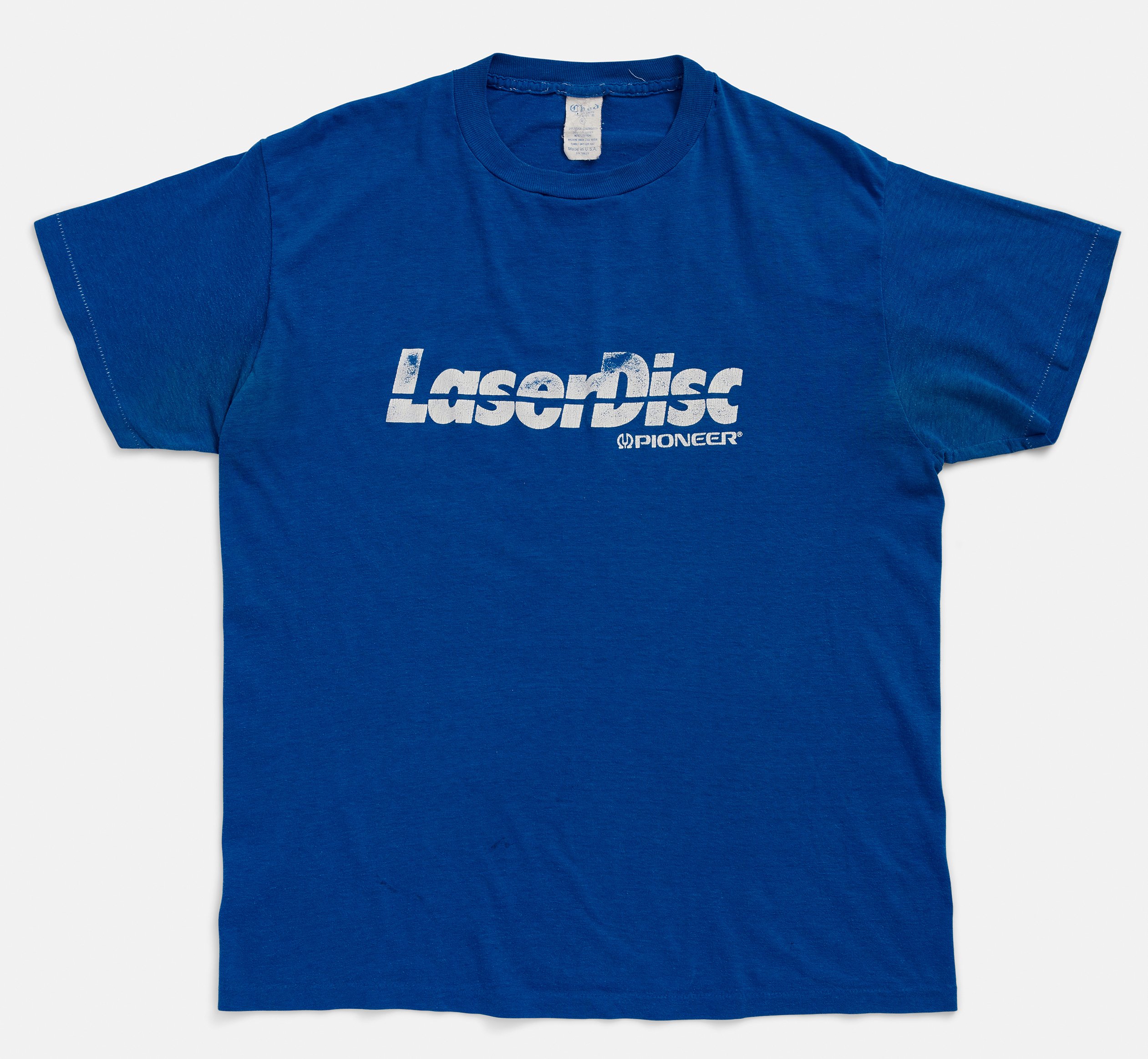 LaserDisc promotional tee from the early 80s. "PIONEER The future of sound and vision" graphic on back. White contrast stitching on backside collar and shoulders. Good vintage condition with great wear on graphics.