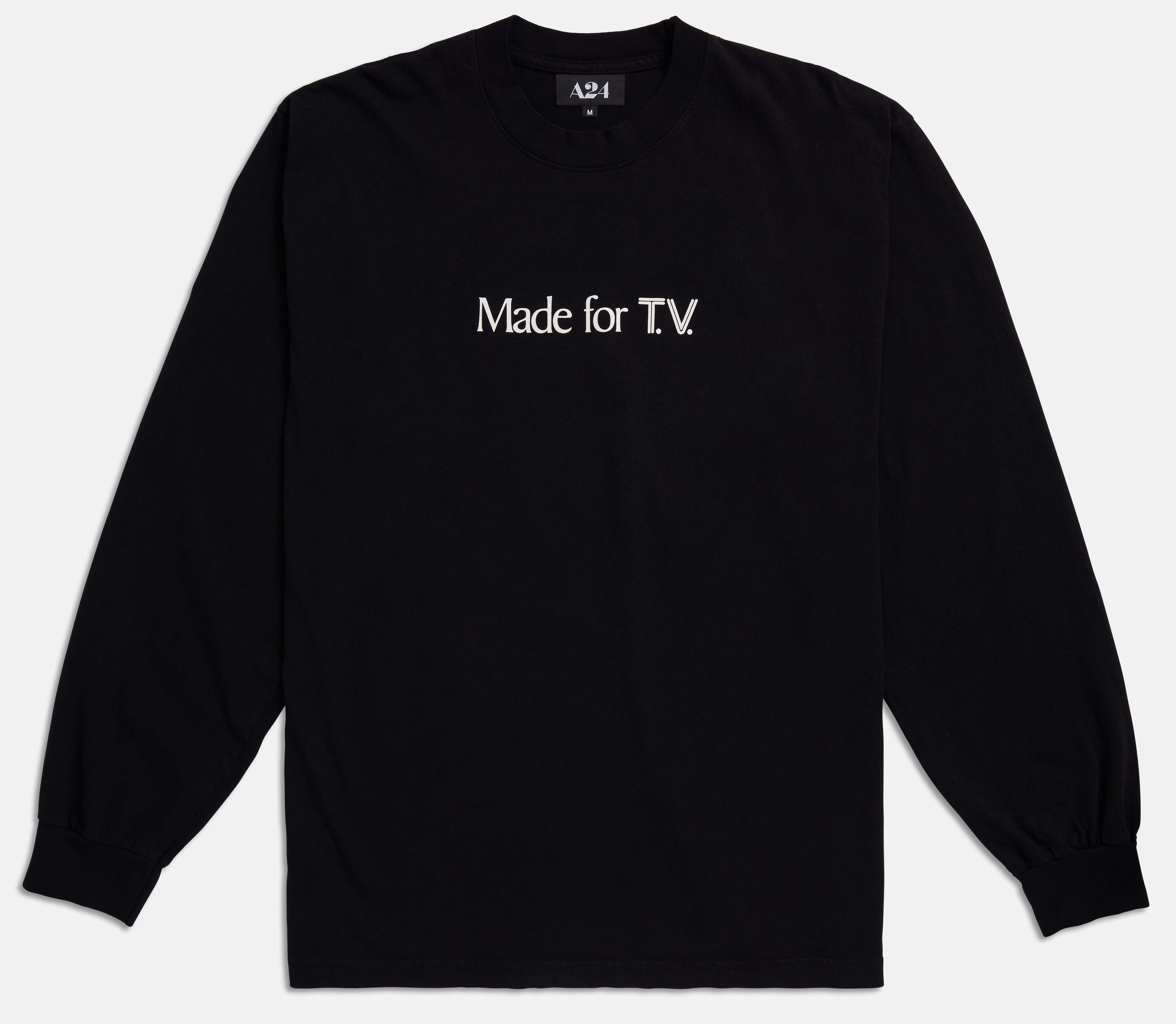 100% cotton black long sleeve t-shirt with printed text on the front and a special warped television logo on the back on the back.