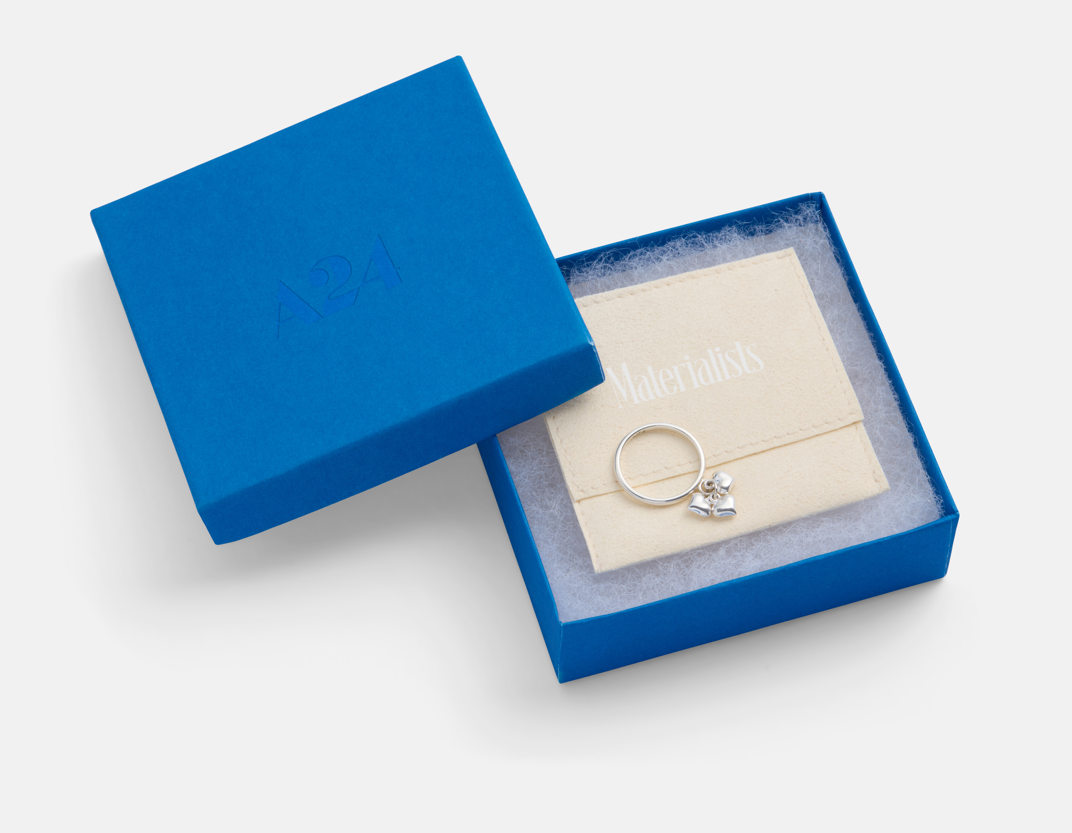 â—‹ 2mm rounded band featuring, 3 7mm dangling heart charms