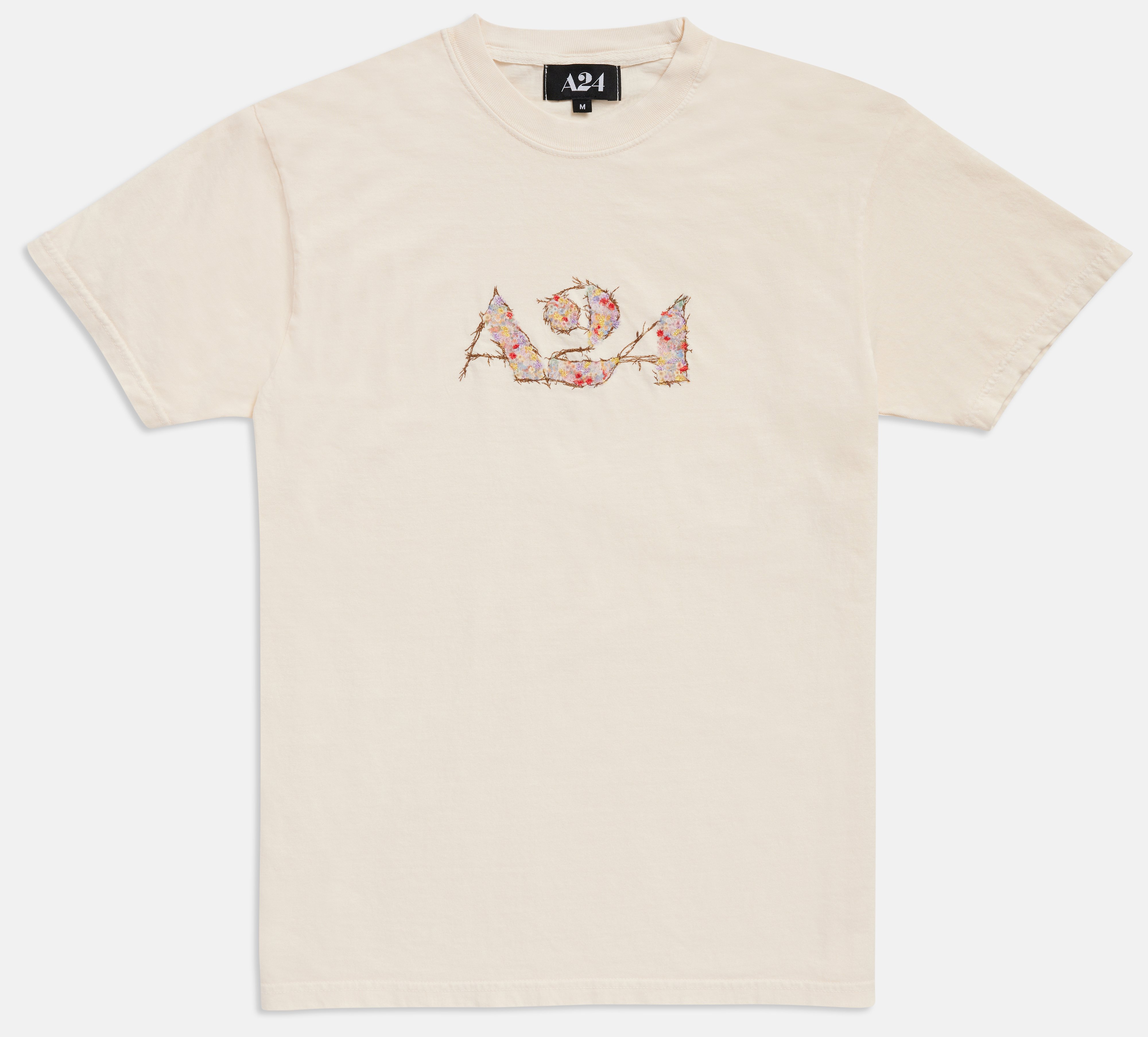 Four color embroidered logo on hand-dyed, short sleeve cotton t-shirt. A24 woven label inside. Fits true-to-size.