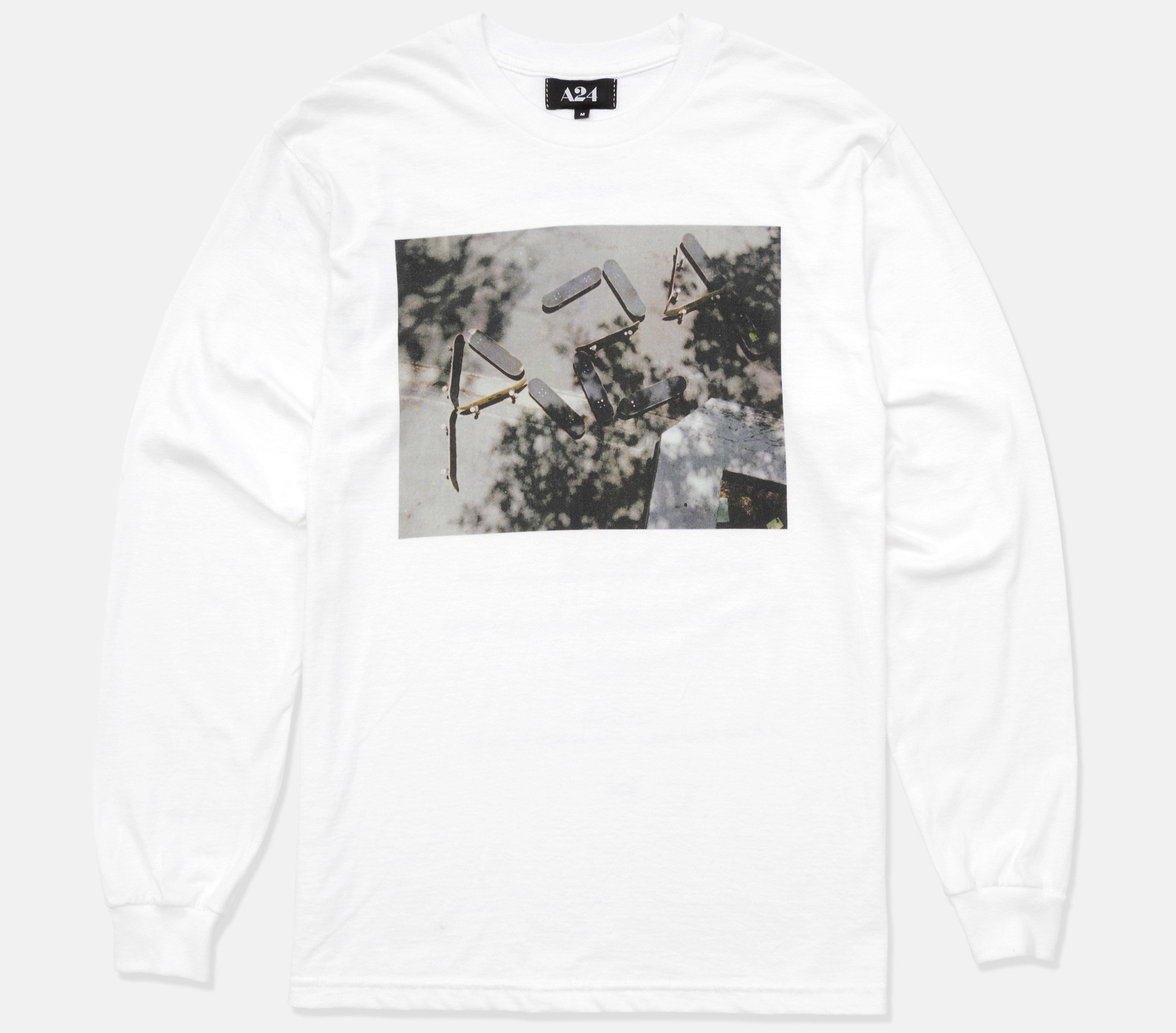 White long sleeve cotton t-shirt with film image on front, Mid90s end scroll on back, and A24 woven label inside. Fits true-to-size.
