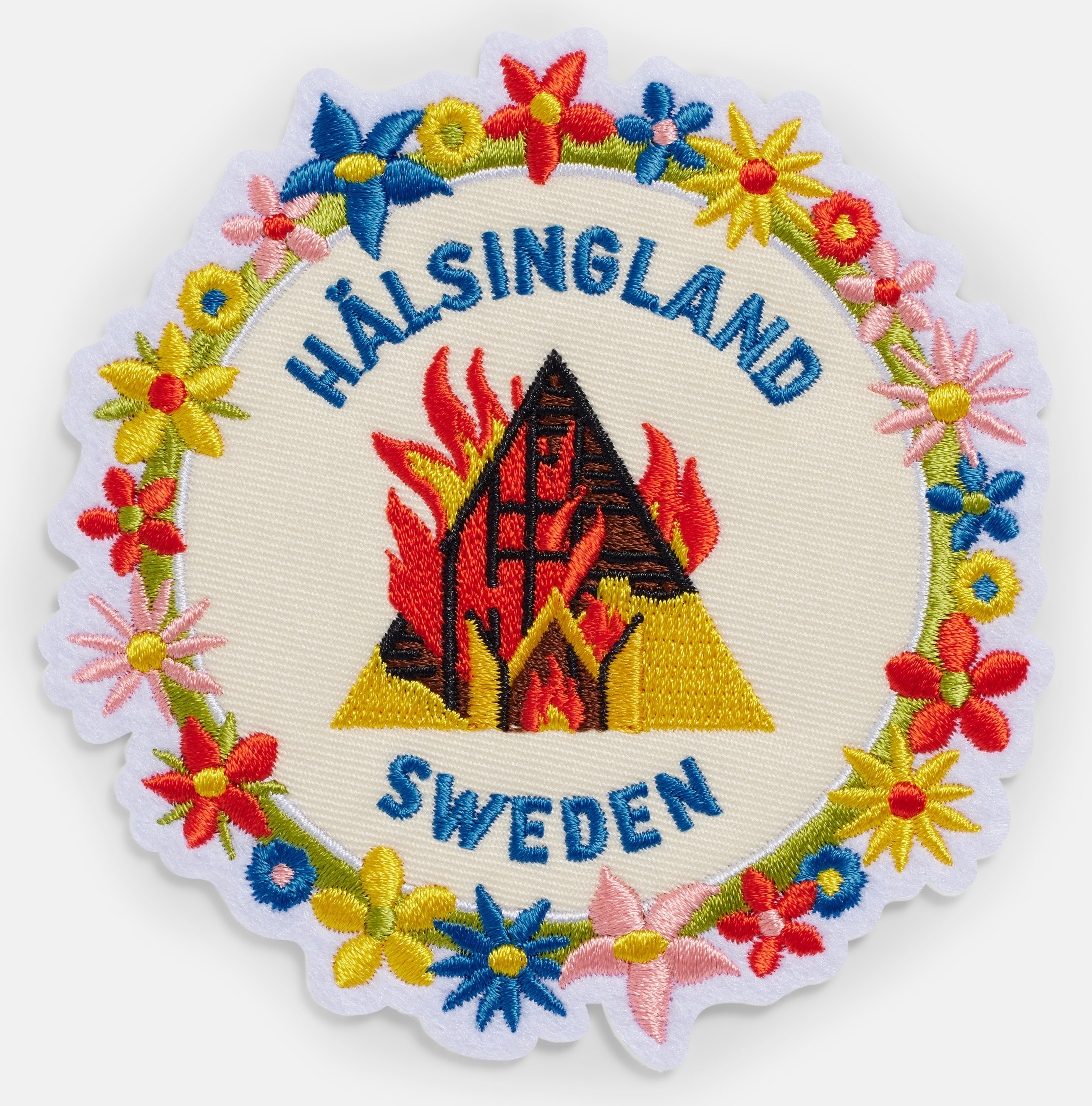 Circular patch embroidered with a burning Midsommar temple and flower crown edge.