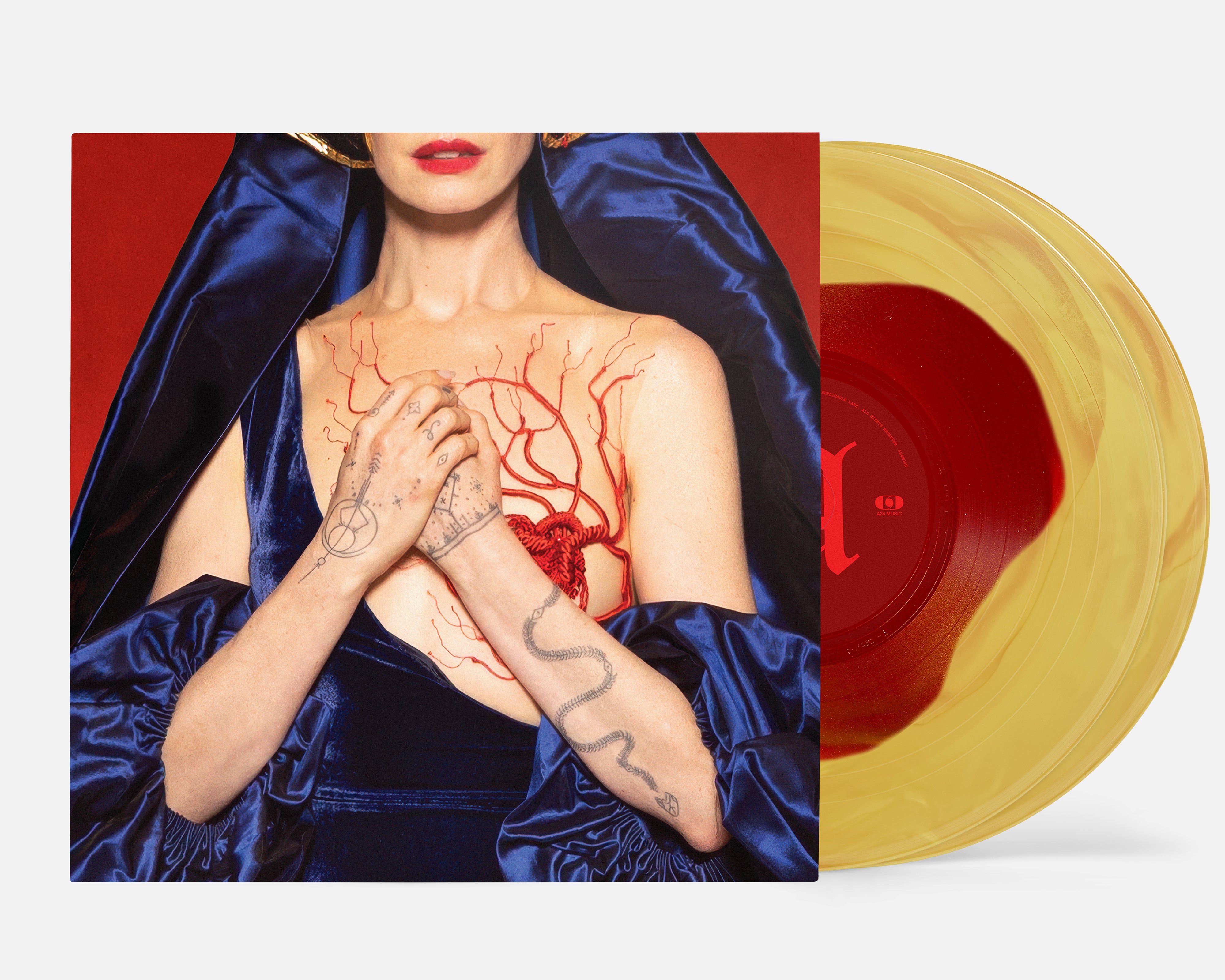 Mother Mary Original Soundtrack pressed on crimson and gold vinyl. Featuring original songs performed by Anne Hathaway, and co-written by Jack Antonoff, Charli xcx, FKA twigs, and Anne Hathaway, plus the original score from composer Daniel Hart.