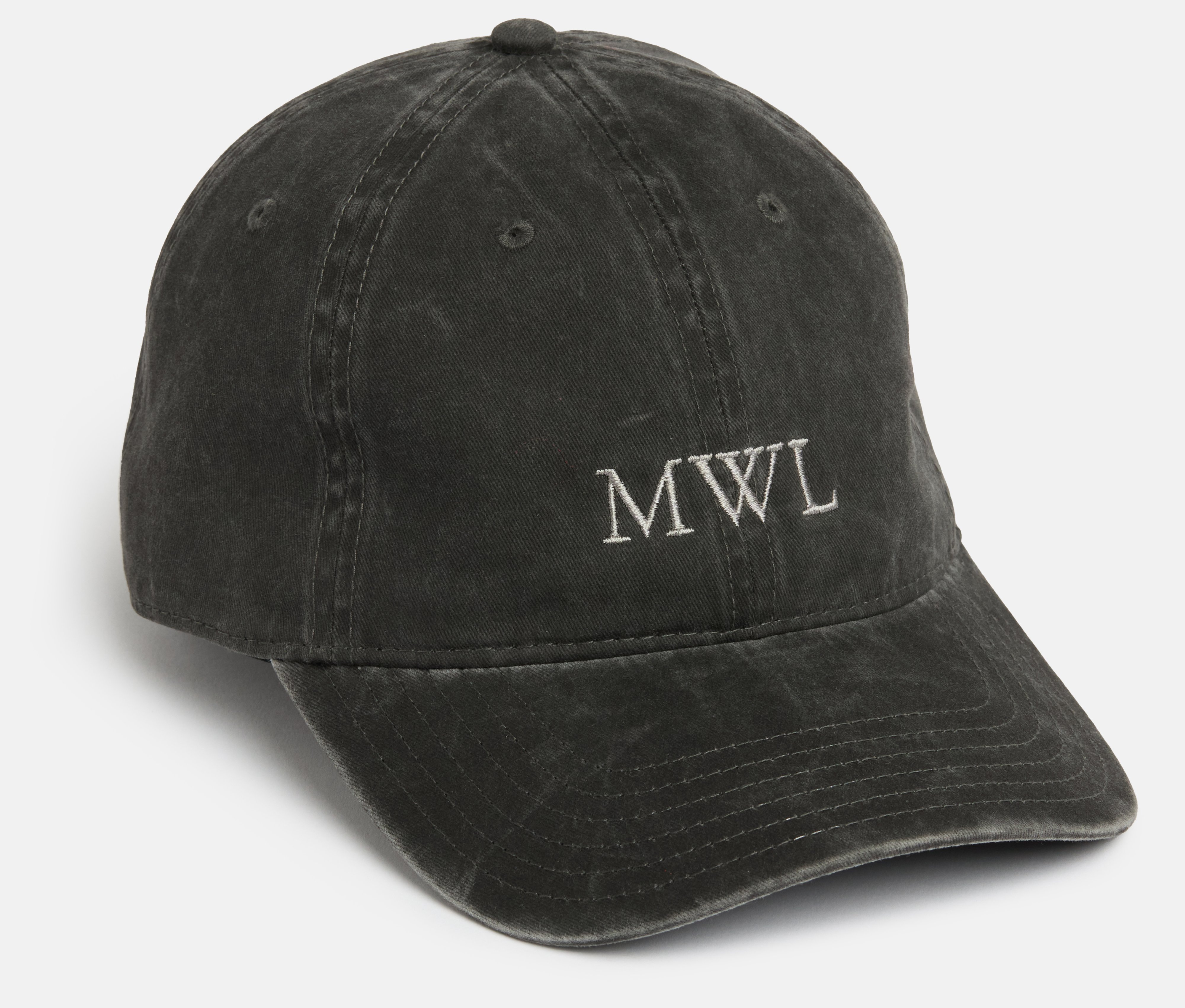 Washed-out black, structured lightweight cotton twill cap with adjustable strap. Gray embroidered Mark William Lewis monogram on the front.
