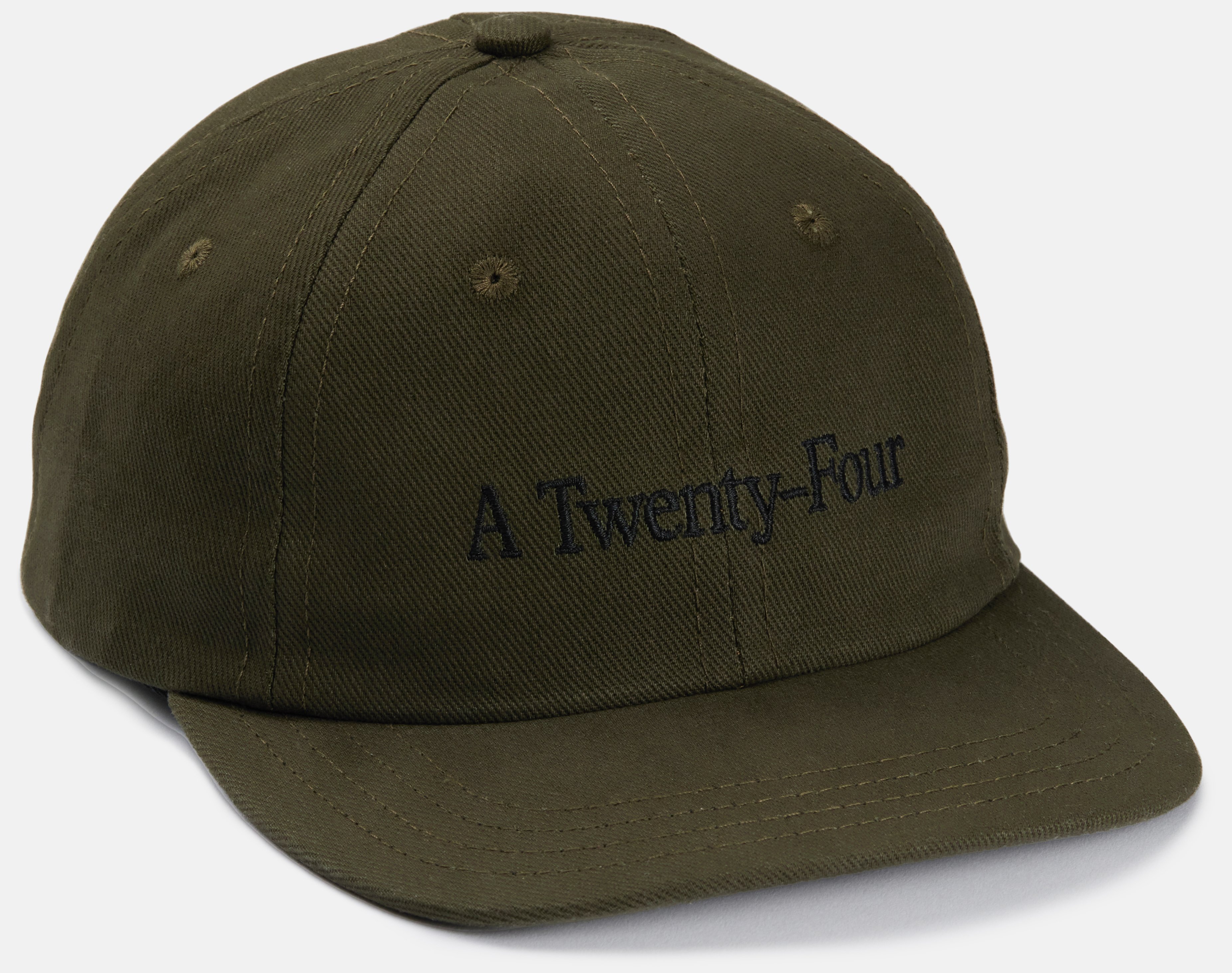 Olive brushed cotton twill cap, with pre-curved visor and adjustable nylon strap. Black embroidery on front and back.