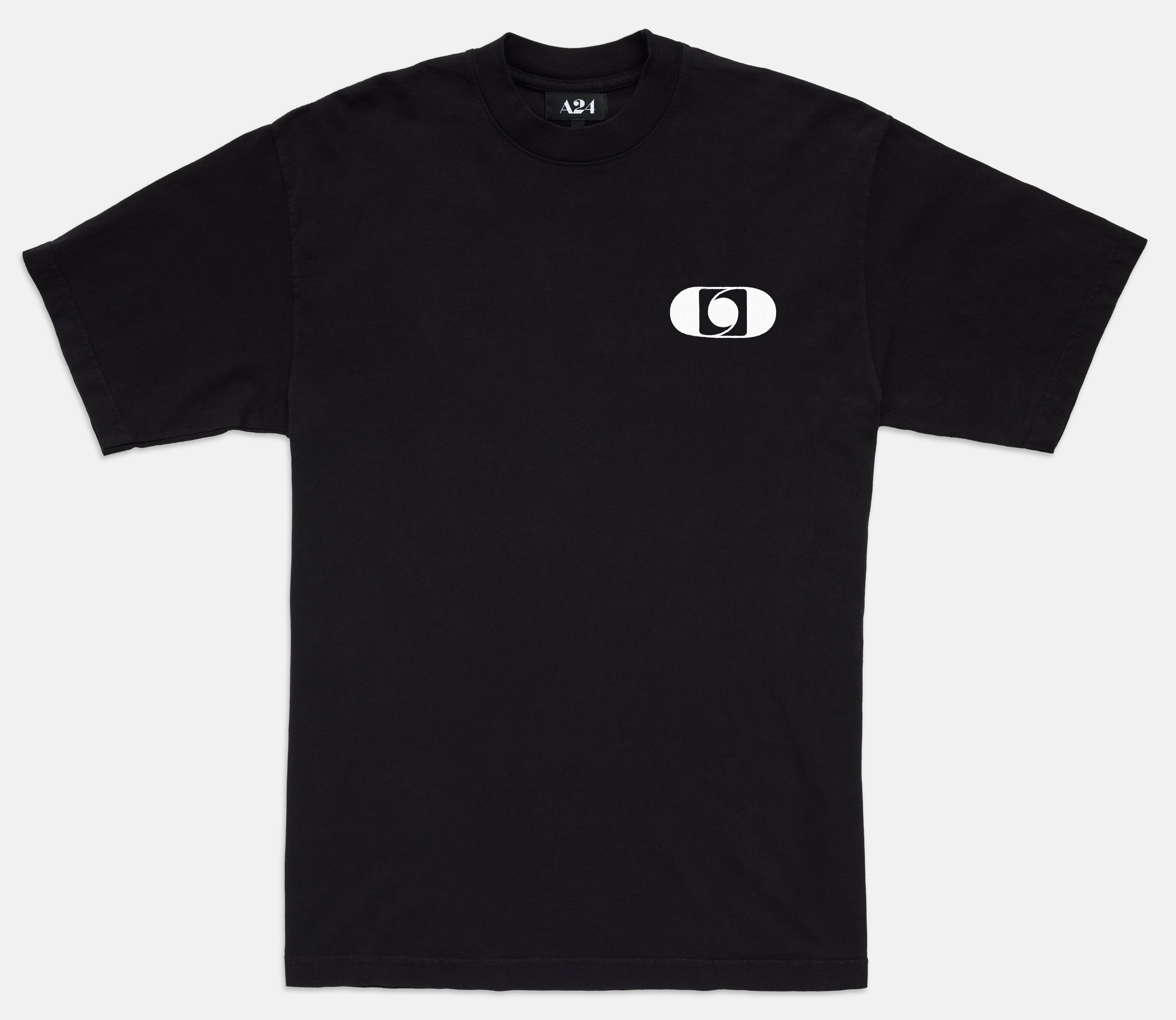 Black screenprinted t-shirt with logo on front and A24 Music graphic on back.
