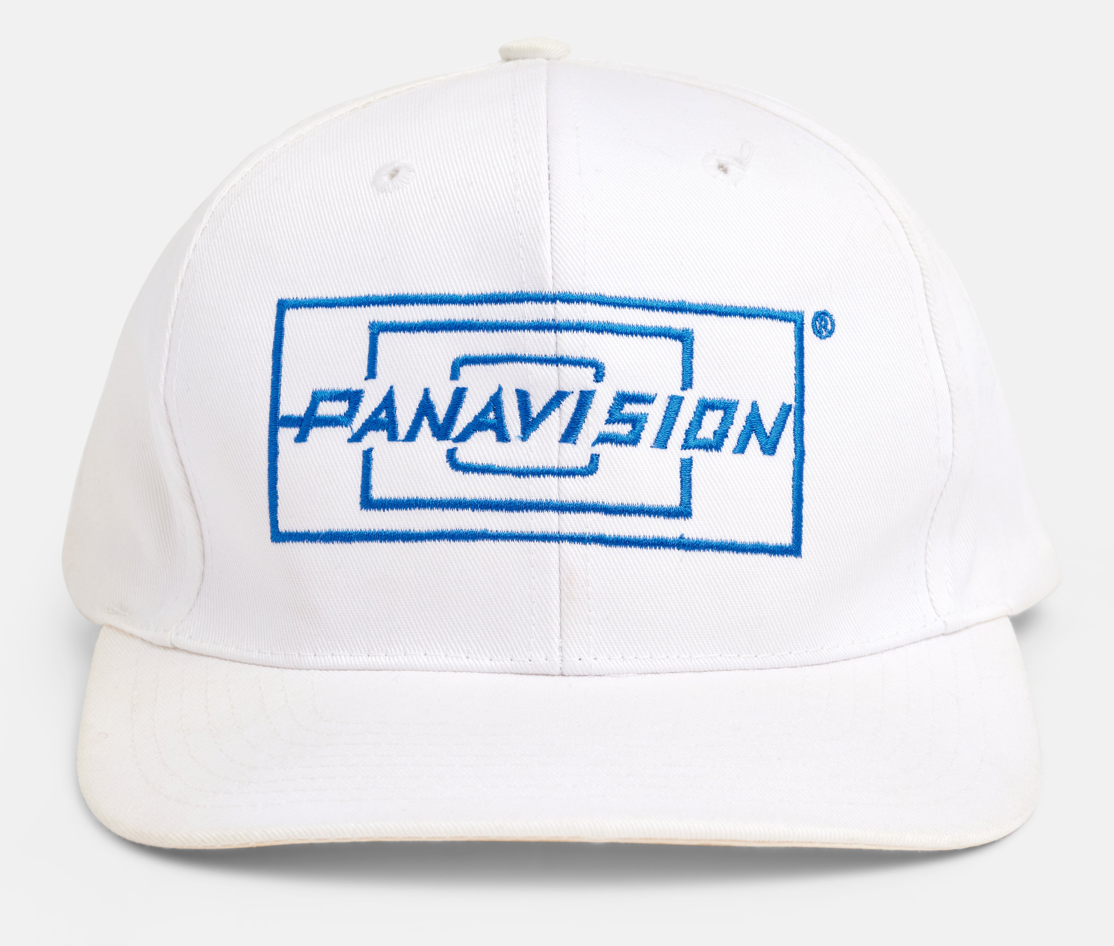 Panavision snapback hat with blue embroidery on white polyester. Excellent condition.