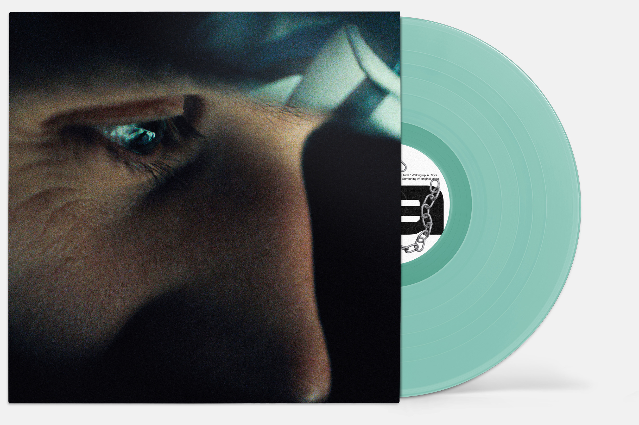 Oliver Coates’s original score for Pillion pressed on transparent cut glass vinyl, featuring lock and key transparent o-card.