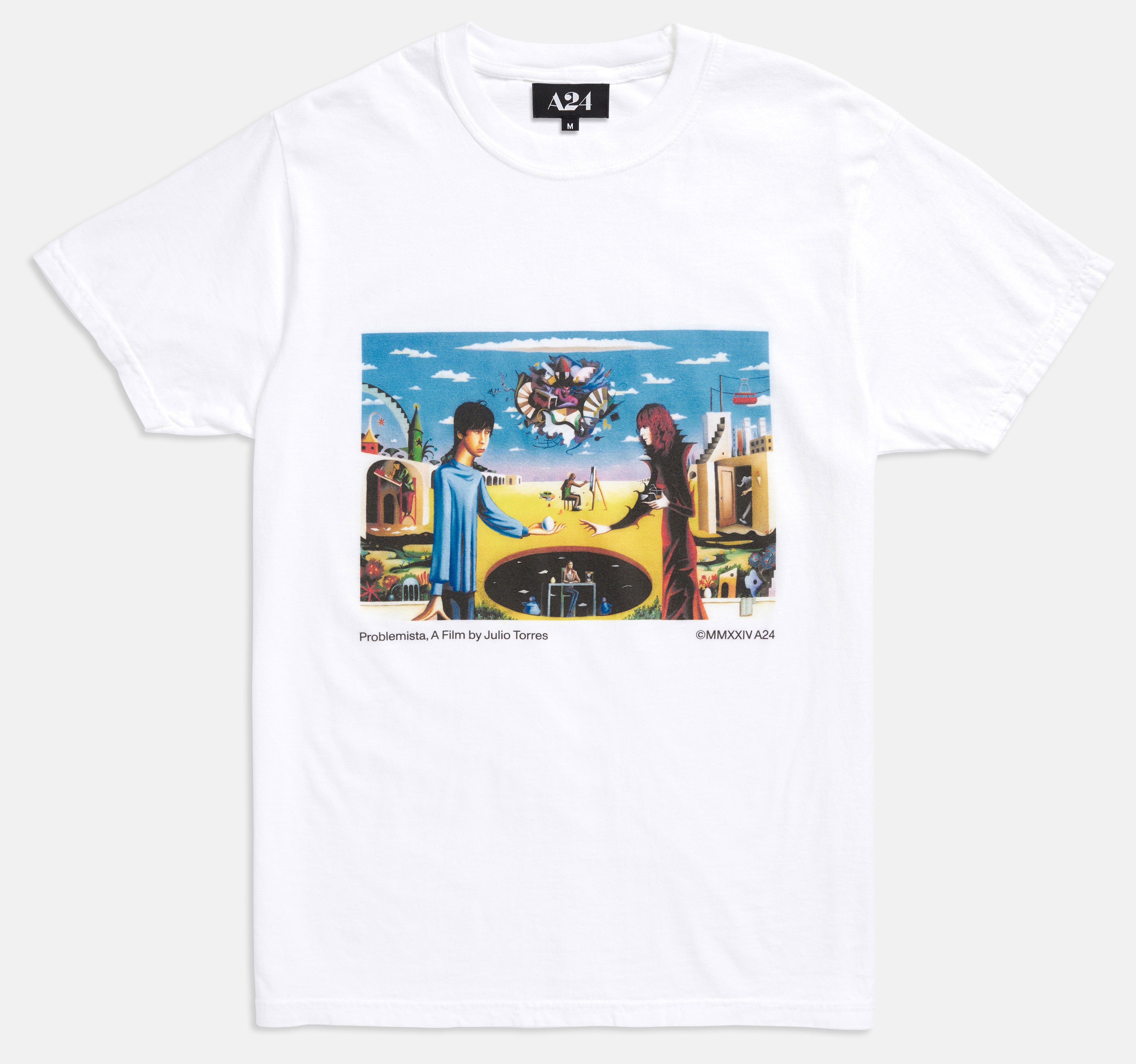 White t-shirt featuring mural art for Problemista by Justin Liam O'Brien.