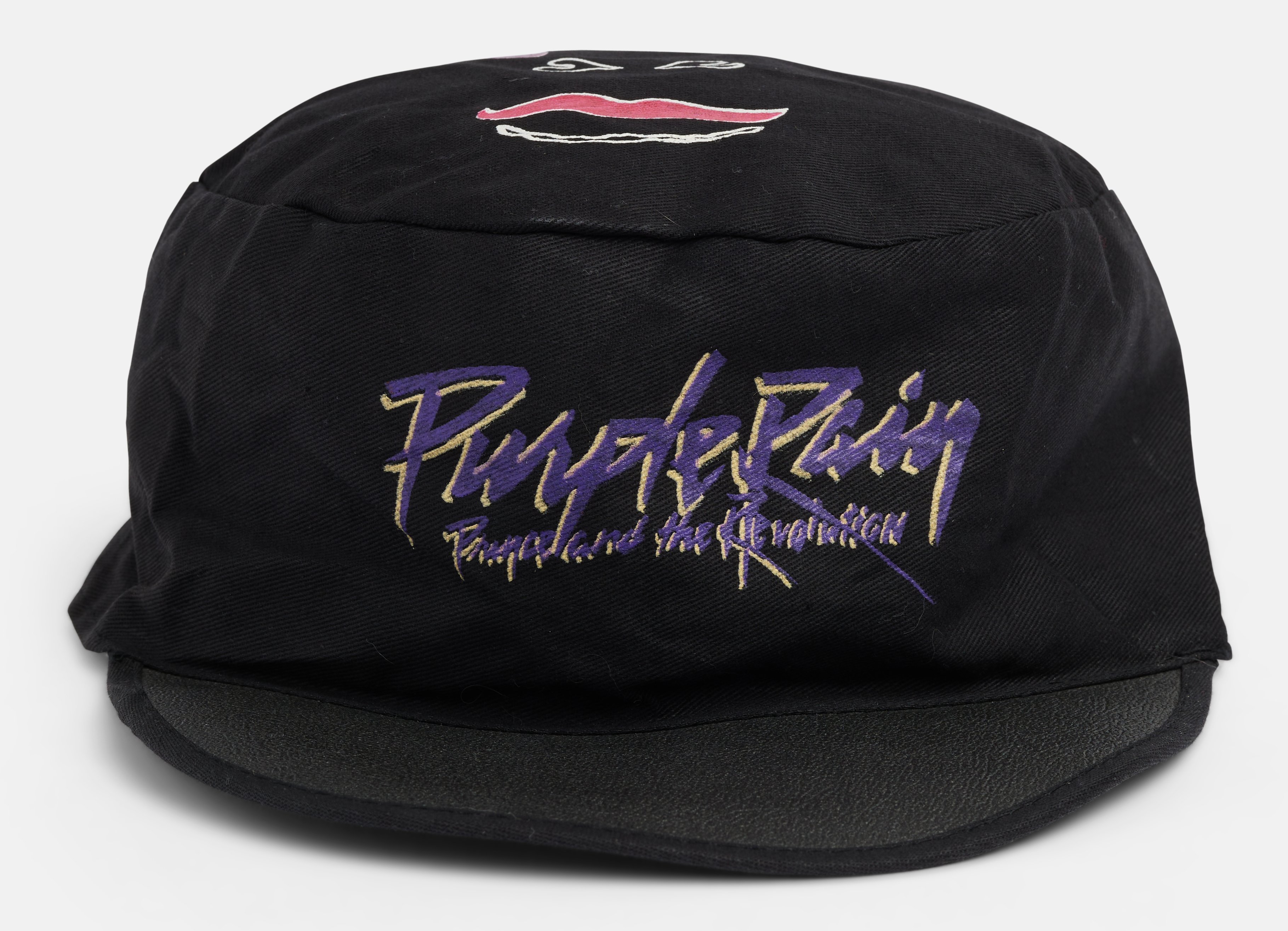 Purple Rain painters cap with title screenprint and face graphic on top. Plastic bill. Good vintage condition.