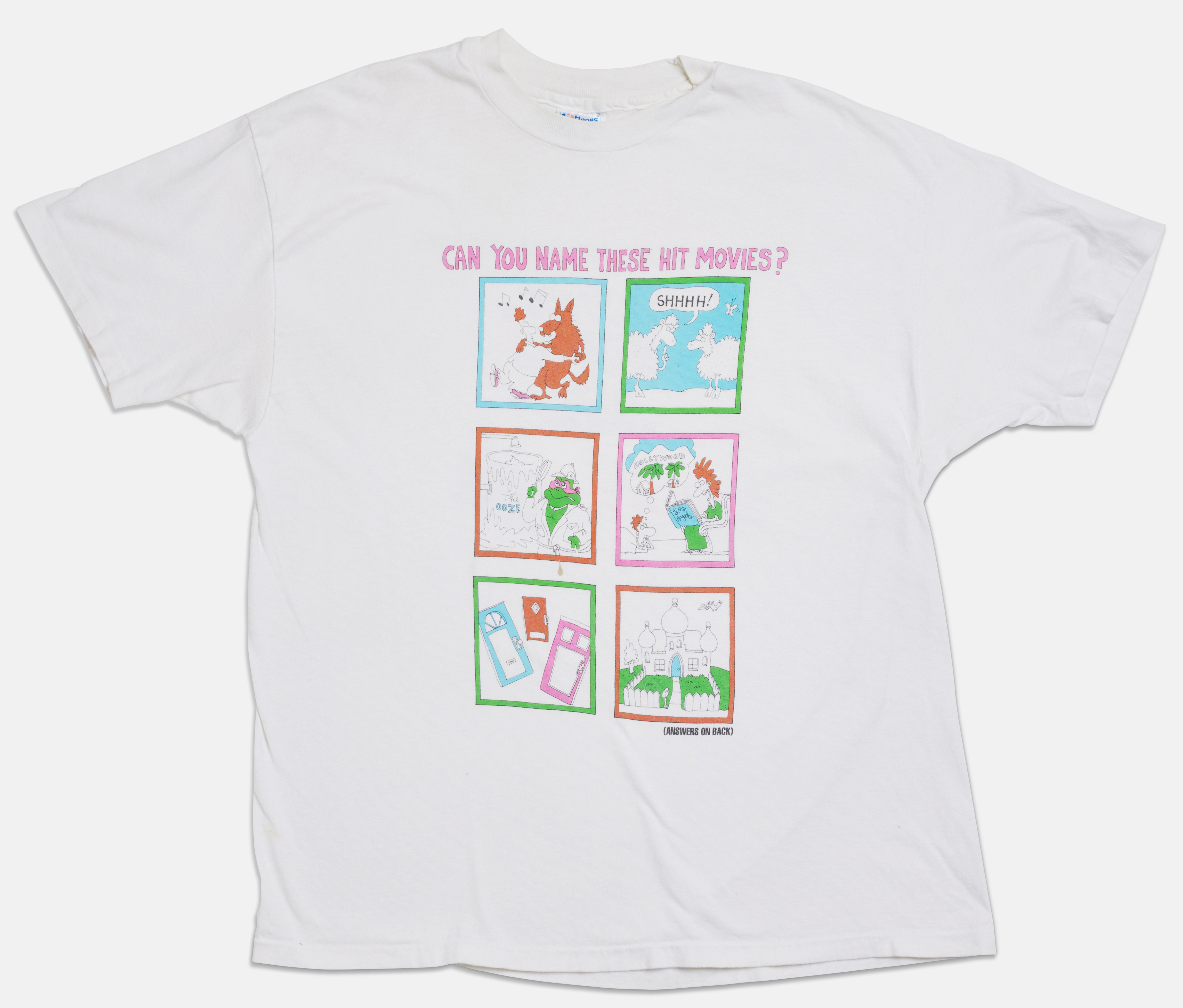 "Can you name these hit movies?" Showtime promotional t-shirt (1990) with cartoon illustrations on front. Great vintage condition with a small paint spot on front.