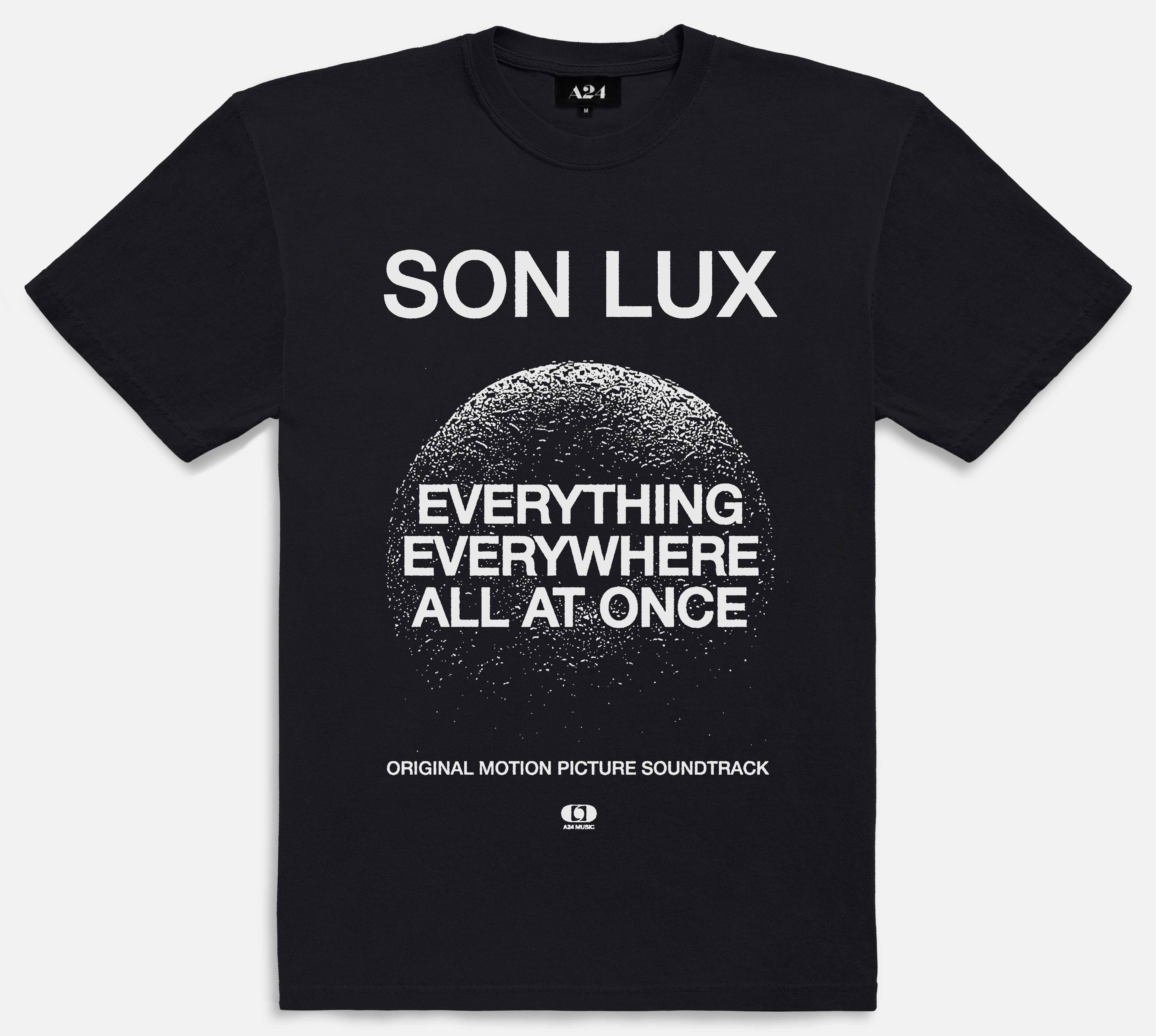 Get sucked into the bagel. Black and white screenprinted t-shirt celebrating Son Lux’s 49-track Oscar-nominated soundtrack for Everything Everywhere All at Once.