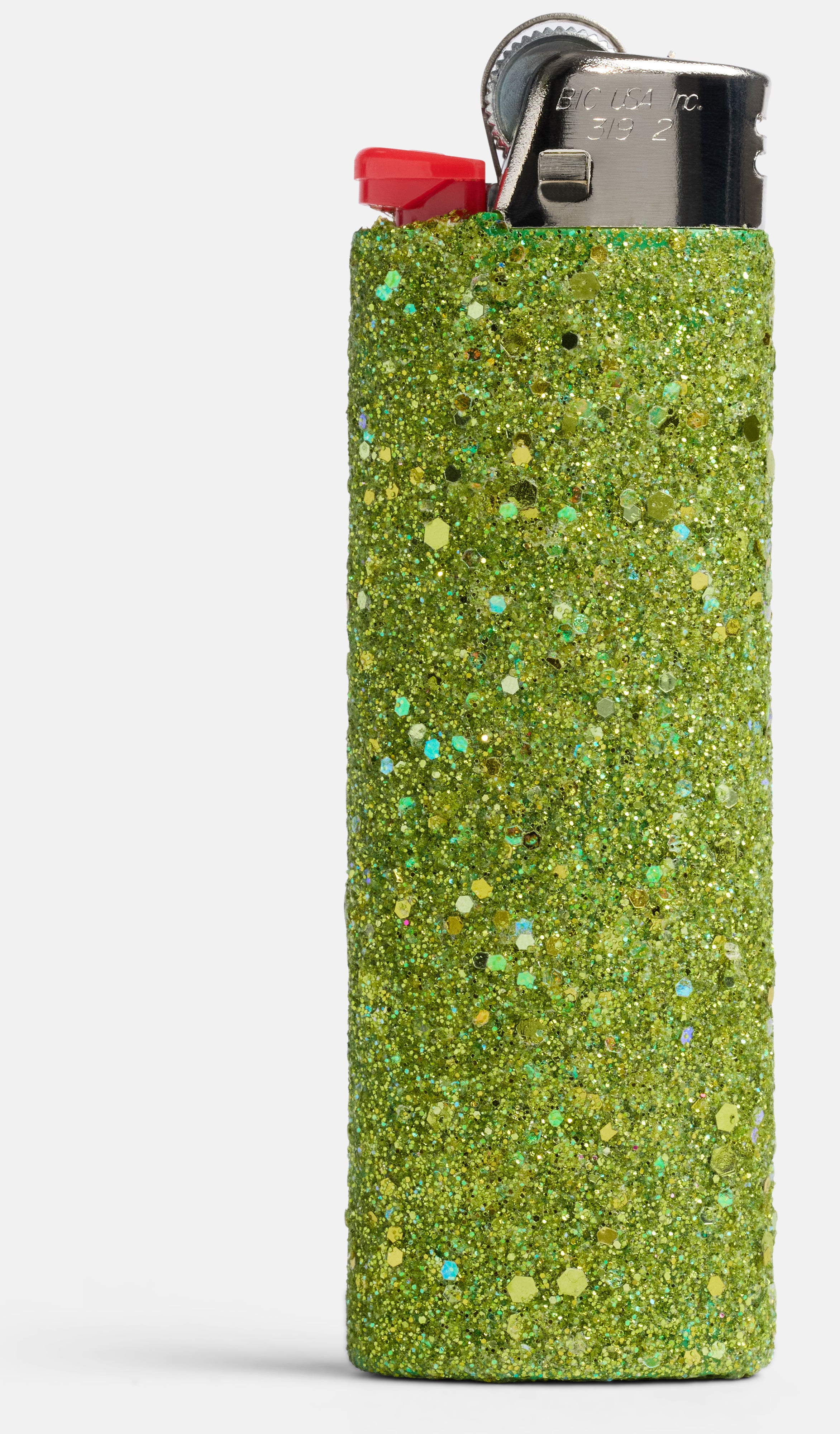 Glittery green lighter with The Moment clear plastic carry bag. Handmade in Los Angeles.