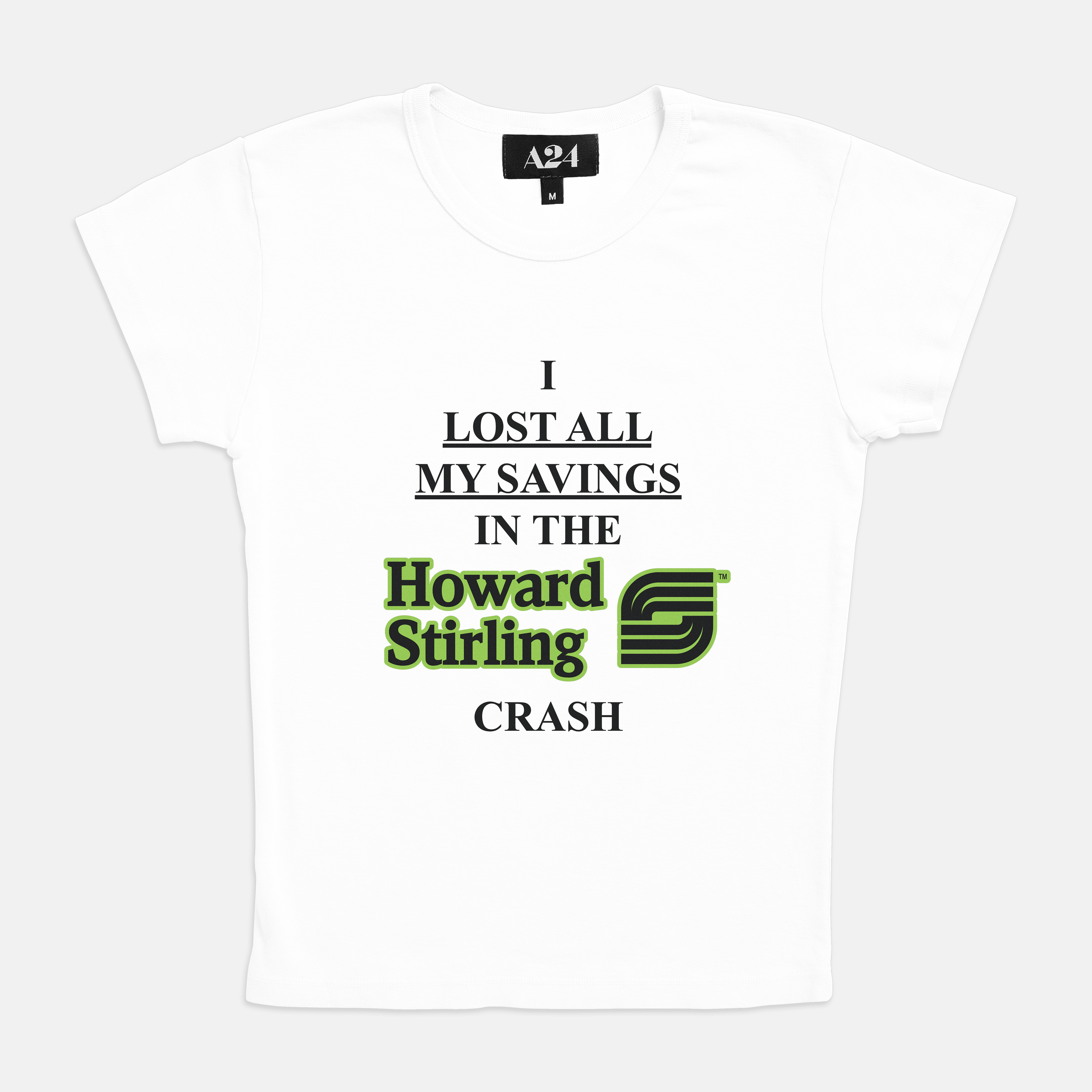 White short sleeve cotton tee with screen printed black and green graphics. A24 screen printed graphic on back. Cropped fit.