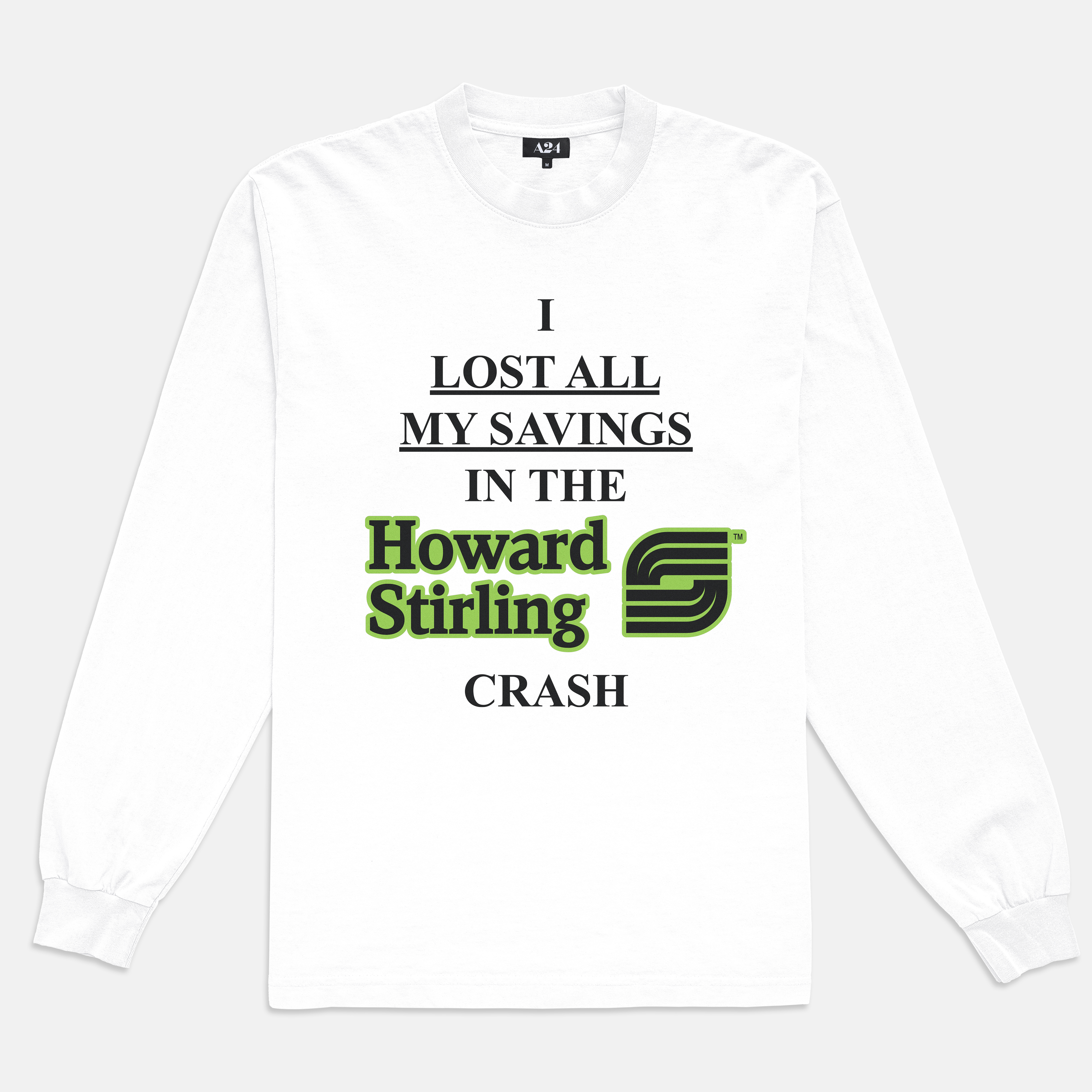White long sleeve t-shirt with screen printed black and green graphics. A24 screen printed graphic on back.
