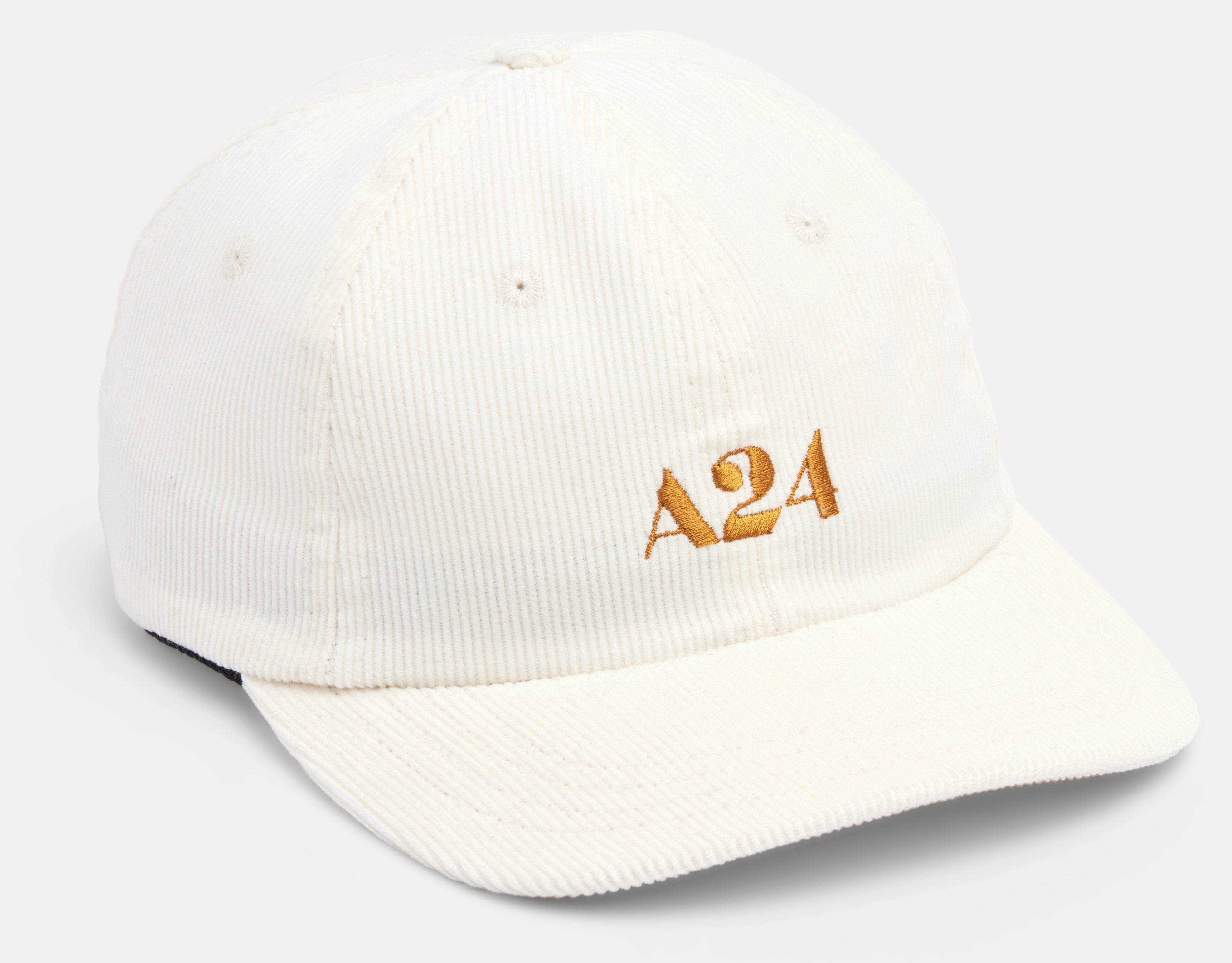 White corduroy hat with gold embroidery on front and back.