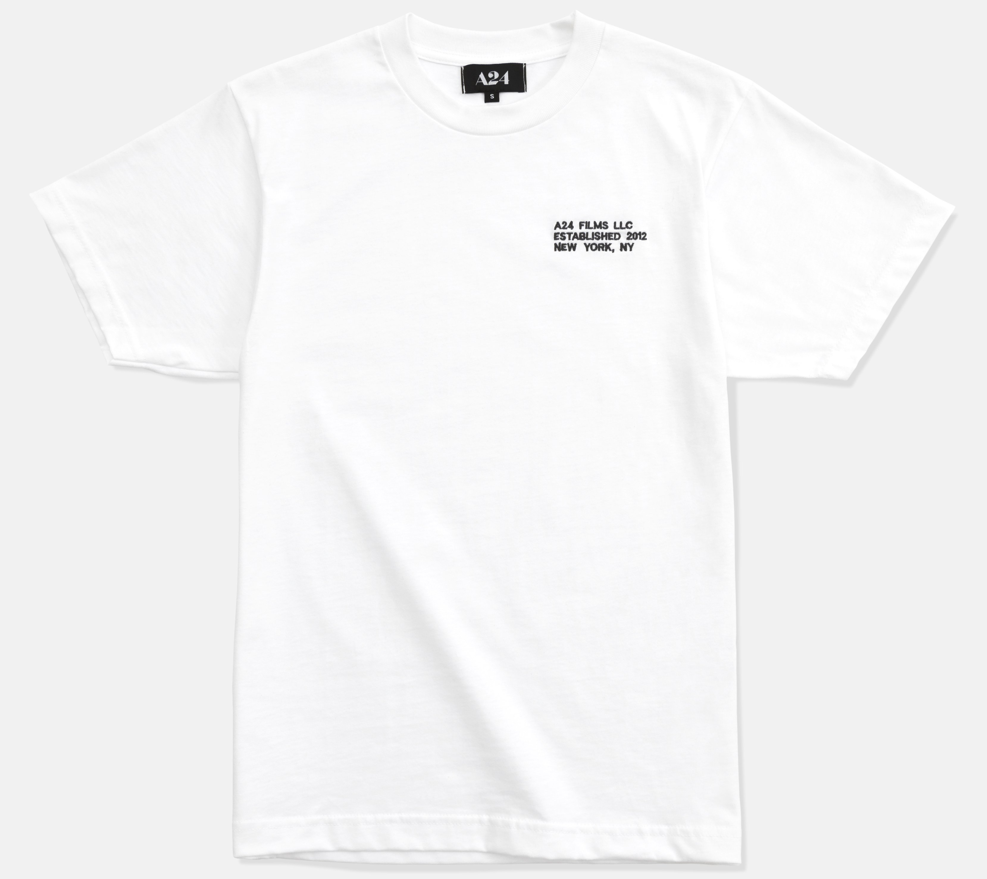 White short sleeve cotton t-shirt with black embroidery on left chest and A24 woven label inside. Fits true-to-size.