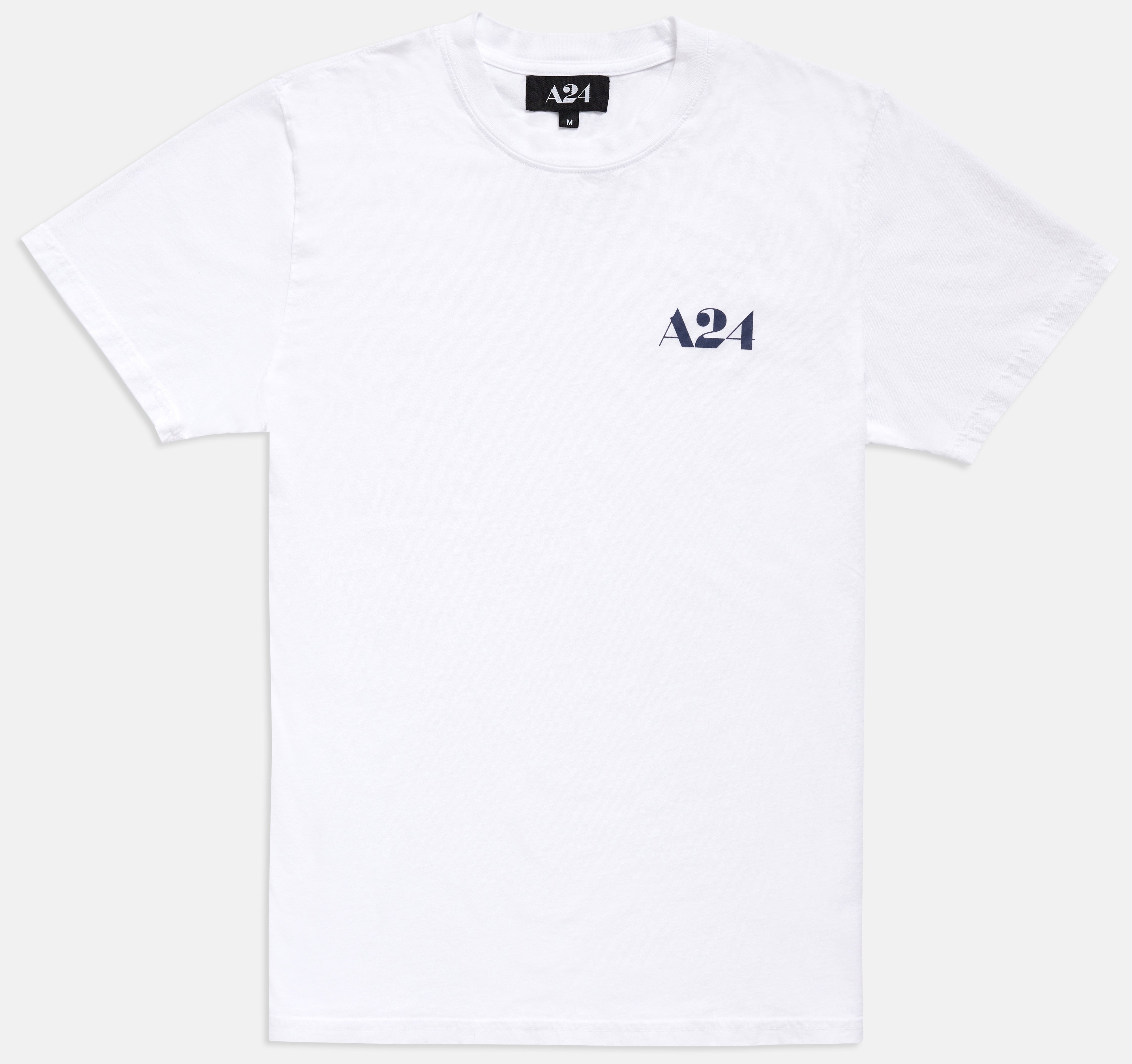 Soft cotton blend cut-and-sew t-shirt in white. Navy blue logo on left chest and A24 woven label inside. Fits true-to-size.